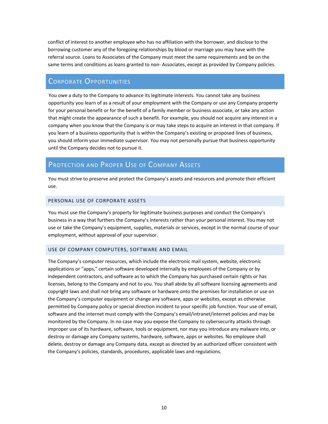 10 conflict of interest to another employee who has no affiliation with the borrower, and disclose to the borrowing customer any of the foregoing relationships by blood or marriage you may have with the referral source. Loans to Associates of the Company must meet the same requirements and be on the same terms and conditions as loans granted to non- Associates, except as provided by Company policies. CORPORATE OPPORTUNITIES You owe a duty to the Company to advance its legitimate interests. You cannot take any business opportunity you learn of as a result of your employment with the Company or use any Company property for your personal benefit or for the benefit of a family member or business associate, or take any action that might create the appearance of such a benefit. For example, you should not acquire any interest in a company when you know that the Company is or may take steps to acquire an interest in that company. If you learn of a business opportunity that is within the Company’s existing or proposed lines of business, you should inform your immediate supervisor. You may not personally pursue that business opportunity until the Company decides not to pursue it. PROTECTION AND PROPER USE OF COMPANY ASSETS You must strive to preserve and protect the Company’s assets and resources and promote their efficient use. PERSONAL USE OF CORPORATE ASSETS You must use the Company’s property for legitimate business purposes and conduct the Company’s business in a way that furthers the Company’s interests rather than your personal interest. You may not use or take the Company’s equipment, supplies, materials or services, except in the normal course of your employment, without approval of your supervisor. USE OF COMPANY COMPUTERS, SOFTWARE AND EMAIL The Company’s computer resources, which include the electronic mail system, website, electronic applications or “apps,” certain software developed internally by employees of the Company or by independent contractors, and software as to which the Company has purchased certain rights or has licenses, belong to the Company and not to you. You shall abide by all software licensing agreements and copyright laws and shall not bring any software or hardware onto the premises for installation or use on the Company’s computer equipment or change any software, apps or websites, except as otherwise permitted by Company policy or special direction incident to your specific job function. Your use of email, software and the internet must comply with the Company’s email/intranet/internet policies and may be monitored by the Company. In no case may you expose the Company to cybersecurity attacks through improper use of its hardware, software, tools or equipment, nor may you introduce any malware into, or destroy or damage any Company systems, hardware, software, apps or websites. No employee shall delete, destroy or damage any Company data, except as directed by an authorized officer consistent with the Company’s policies, standards, procedures, applicable laws and regulations.
