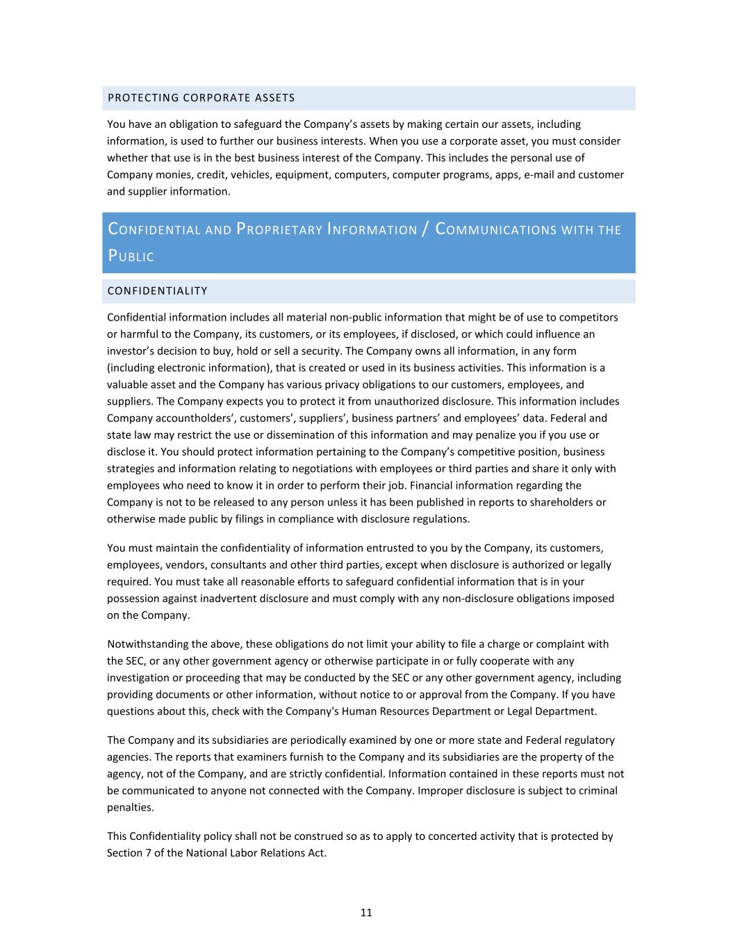11 PROTECTING CORPORATE ASSETS You have an obligation to safeguard the Company’s assets by making certain our assets, including information, is used to further our business interests. When you use a corporate asset, you must consider whether that use is in the best business interest of the Company. This includes the personal use of Company monies, credit, vehicles, equipment, computers, computer programs, apps, e-mail and customer and supplier information. CONFIDENTIAL AND PROPRIETARY INFORMATION / COMMUNICATIONS WITH THE PUBLIC CONFIDENTIALITY Confidential information includes all material non-public information that might be of use to competitors or harmful to the Company, its customers, or its employees, if disclosed, or which could influence an investor’s decision to buy, hold or sell a security. The Company owns all information, in any form (including electronic information), that is created or used in its business activities. This information is a valuable asset and the Company has various privacy obligations to our customers, employees, and suppliers. The Company expects you to protect it from unauthorized disclosure. This information includes Company accountholders’, customers’, suppliers’, business partners’ and employees’ data. Federal and state law may restrict the use or dissemination of this information and may penalize you if you use or disclose it. You should protect information pertaining to the Company’s competitive position, business strategies and information relating to negotiations with employees or third parties and share it only with employees who need to know it in order to perform their job. Financial information regarding the Company is not to be released to any person unless it has been published in reports to shareholders or otherwise made public by filings in compliance with disclosure regulations. You must maintain the confidentiality of information entrusted to you by the Company, its customers, employees, vendors, consultants and other third parties, except when disclosure is authorized or legally required. You must take all reasonable efforts to safeguard confidential information that is in your possession against inadvertent disclosure and must comply with any non-disclosure obligations imposed on the Company. Notwithstanding the above, these obligations do not limit your ability to file a charge or complaint with the SEC, or any other government agency or otherwise participate in or fully cooperate with any investigation or proceeding that may be conducted by the SEC or any other government agency, including providing documents or other information, without notice to or approval from the Company. If you have questions about this, check with the Company's Human Resources Department or Legal Department. The Company and its subsidiaries are periodically examined by one or more state and Federal regulatory agencies. The reports that examiners furnish to the Company and its subsidiaries are the property of the agency, not of the Company, and are strictly confidential. Information contained in these reports must not be communicated to anyone not connected with the Company. Improper disclosure is subject to criminal penalties. This Confidentiality policy shall not be construed so as to apply to concerted activity that is protected by Section 7 of the National Labor Relations Act.