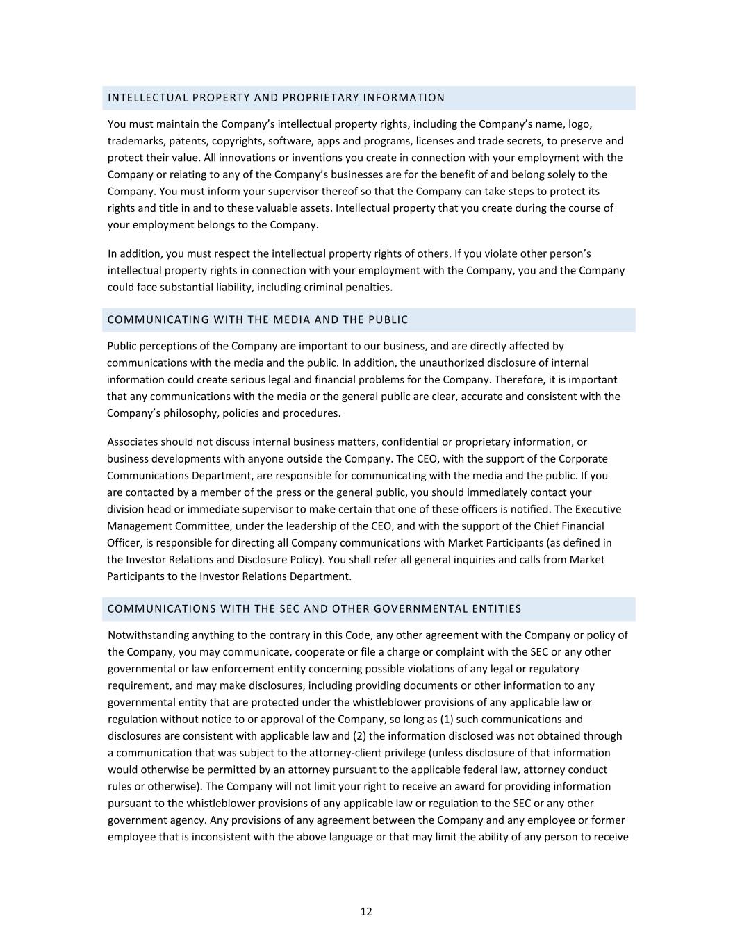 12 INTELLECTUAL PROPERTY AND PROPRIETARY INFORMATION You must maintain the Company’s intellectual property rights, including the Company’s name, logo, trademarks, patents, copyrights, software, apps and programs, licenses and trade secrets, to preserve and protect their value. All innovations or inventions you create in connection with your employment with the Company or relating to any of the Company’s businesses are for the benefit of and belong solely to the Company. You must inform your supervisor thereof so that the Company can take steps to protect its rights and title in and to these valuable assets. Intellectual property that you create during the course of your employment belongs to the Company. In addition, you must respect the intellectual property rights of others. If you violate other person’s intellectual property rights in connection with your employment with the Company, you and the Company could face substantial liability, including criminal penalties. COMMUNICATING WITH THE MEDIA AND THE PUBLIC Public perceptions of the Company are important to our business, and are directly affected by communications with the media and the public. In addition, the unauthorized disclosure of internal information could create serious legal and financial problems for the Company. Therefore, it is important that any communications with the media or the general public are clear, accurate and consistent with the Company’s philosophy, policies and procedures. Associates should not discuss internal business matters, confidential or proprietary information, or business developments with anyone outside the Company. The CEO, with the support of the Corporate Communications Department, are responsible for communicating with the media and the public. If you are contacted by a member of the press or the general public, you should immediately contact your division head or immediate supervisor to make certain that one of these officers is notified. The Executive Management Committee, under the leadership of the CEO, and with the support of the Chief Financial Officer, is responsible for directing all Company communications with Market Participants (as defined in the Investor Relations and Disclosure Policy). You shall refer all general inquiries and calls from Market Participants to the Investor Relations Department. COMMUNICATIONS WITH THE SEC AND OTHER GOVERNMENTAL ENTITIES Notwithstanding anything to the contrary in this Code, any other agreement with the Company or policy of the Company, you may communicate, cooperate or file a charge or complaint with the SEC or any other governmental or law enforcement entity concerning possible violations of any legal or regulatory requirement, and may make disclosures, including providing documents or other information to any governmental entity that are protected under the whistleblower provisions of any applicable law or regulation without notice to or approval of the Company, so long as (1) such communications and disclosures are consistent with applicable law and (2) the information disclosed was not obtained through a communication that was subject to the attorney-client privilege (unless disclosure of that information would otherwise be permitted by an attorney pursuant to the applicable federal law, attorney conduct rules or otherwise). The Company will not limit your right to receive an award for providing information pursuant to the whistleblower provisions of any applicable law or regulation to the SEC or any other government agency. Any provisions of any agreement between the Company and any employee or former employee that is inconsistent with the above language or that may limit the ability of any person to receive