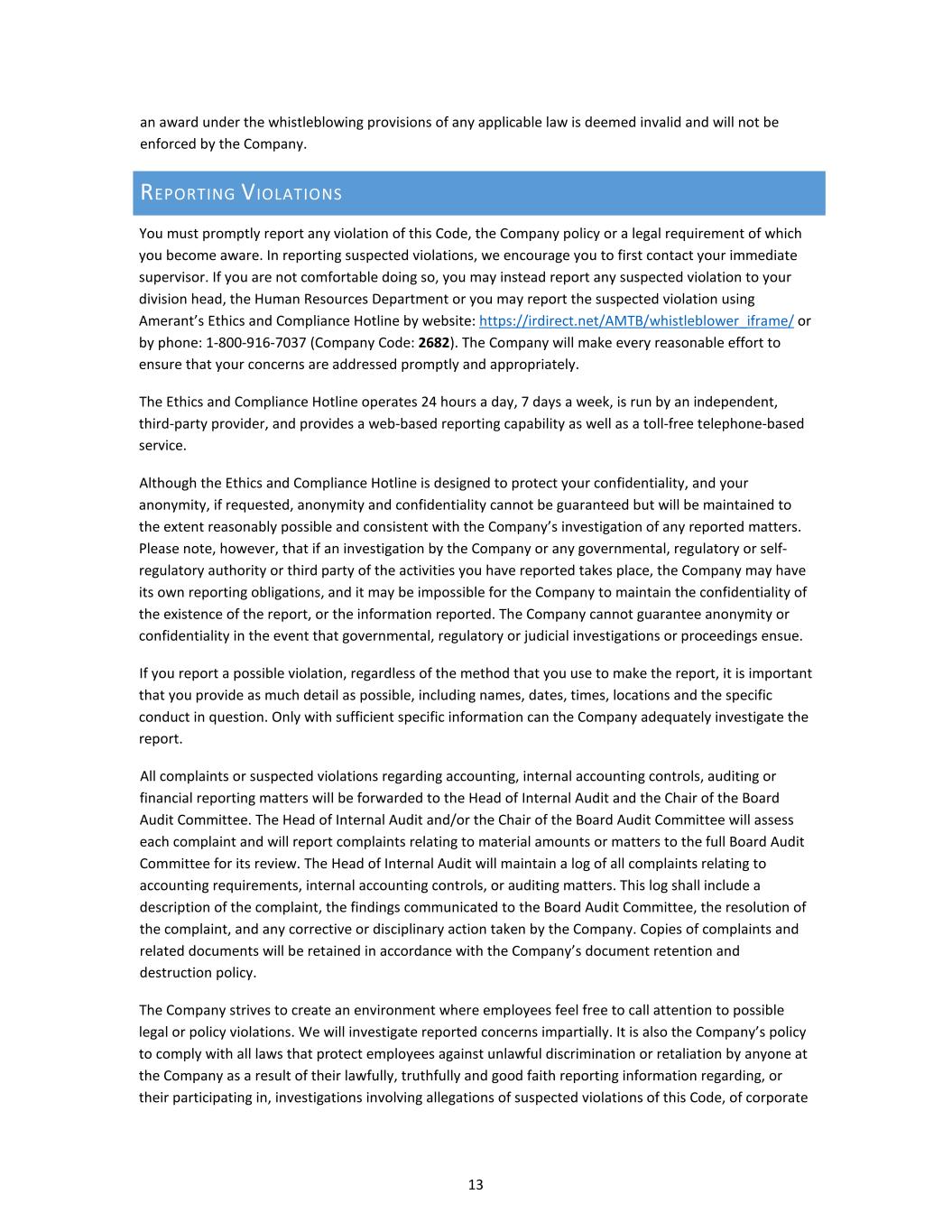 13 an award under the whistleblowing provisions of any applicable law is deemed invalid and will not be enforced by the Company. REPORTING VIOLATIONS You must promptly report any violation of this Code, the Company policy or a legal requirement of which you become aware. In reporting suspected violations, we encourage you to first contact your immediate supervisor. If you are not comfortable doing so, you may instead report any suspected violation to your division head, the Human Resources Department or you may report the suspected violation using Amerant’s Ethics and Compliance Hotline by website: https://irdirect.net/AMTB/whistleblower_iframe/ or by phone: 1-800-916-7037 (Company Code: 2682). The Company will make every reasonable effort to ensure that your concerns are addressed promptly and appropriately. The Ethics and Compliance Hotline operates 24 hours a day, 7 days a week, is run by an independent, third-party provider, and provides a web-based reporting capability as well as a toll-free telephone-based service. Although the Ethics and Compliance Hotline is designed to protect your confidentiality, and your anonymity, if requested, anonymity and confidentiality cannot be guaranteed but will be maintained to the extent reasonably possible and consistent with the Company’s investigation of any reported matters. Please note, however, that if an investigation by the Company or any governmental, regulatory or self- regulatory authority or third party of the activities you have reported takes place, the Company may have its own reporting obligations, and it may be impossible for the Company to maintain the confidentiality of the existence of the report, or the information reported. The Company cannot guarantee anonymity or confidentiality in the event that governmental, regulatory or judicial investigations or proceedings ensue. If you report a possible violation, regardless of the method that you use to make the report, it is important that you provide as much detail as possible, including names, dates, times, locations and the specific conduct in question. Only with sufficient specific information can the Company adequately investigate the report. All complaints or suspected violations regarding accounting, internal accounting controls, auditing or financial reporting matters will be forwarded to the Head of Internal Audit and the Chair of the Board Audit Committee. The Head of Internal Audit and/or the Chair of the Board Audit Committee will assess each complaint and will report complaints relating to material amounts or matters to the full Board Audit Committee for its review. The Head of Internal Audit will maintain a log of all complaints relating to accounting requirements, internal accounting controls, or auditing matters. This log shall include a description of the complaint, the findings communicated to the Board Audit Committee, the resolution of the complaint, and any corrective or disciplinary action taken by the Company. Copies of complaints and related documents will be retained in accordance with the Company’s document retention and destruction policy. The Company strives to create an environment where employees feel free to call attention to possible legal or policy violations. We will investigate reported concerns impartially. It is also the Company’s policy to comply with all laws that protect employees against unlawful discrimination or retaliation by anyone at the Company as a result of their lawfully, truthfully and good faith reporting information regarding, or their participating in, investigations involving allegations of suspected violations of this Code, of corporate