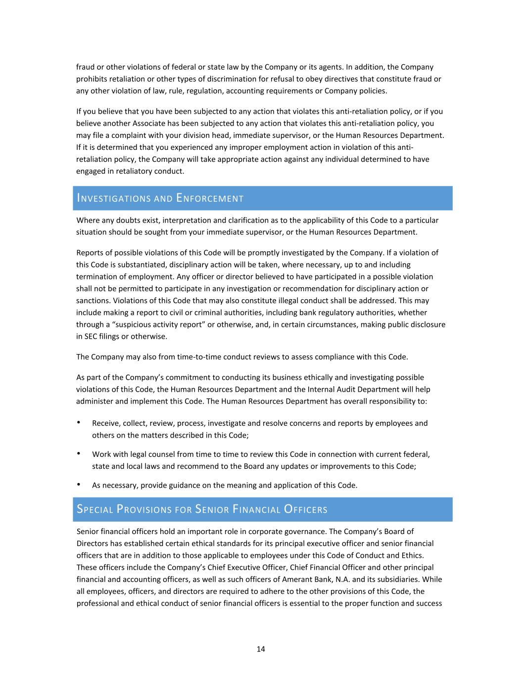 14 fraud or other violations of federal or state law by the Company or its agents. In addition, the Company prohibits retaliation or other types of discrimination for refusal to obey directives that constitute fraud or any other violation of law, rule, regulation, accounting requirements or Company policies. If you believe that you have been subjected to any action that violates this anti-retaliation policy, or if you believe another Associate has been subjected to any action that violates this anti-retaliation policy, you may file a complaint with your division head, immediate supervisor, or the Human Resources Department. If it is determined that you experienced any improper employment action in violation of this anti- retaliation policy, the Company will take appropriate action against any individual determined to have engaged in retaliatory conduct. INVESTIGATIONS AND ENFORCEMENT Where any doubts exist, interpretation and clarification as to the applicability of this Code to a particular situation should be sought from your immediate supervisor, or the Human Resources Department. Reports of possible violations of this Code will be promptly investigated by the Company. If a violation of this Code is substantiated, disciplinary action will be taken, where necessary, up to and including termination of employment. Any officer or director believed to have participated in a possible violation shall not be permitted to participate in any investigation or recommendation for disciplinary action or sanctions. Violations of this Code that may also constitute illegal conduct shall be addressed. This may include making a report to civil or criminal authorities, including bank regulatory authorities, whether through a “suspicious activity report” or otherwise, and, in certain circumstances, making public disclosure in SEC filings or otherwise. The Company may also from time-to-time conduct reviews to assess compliance with this Code. As part of the Company’s commitment to conducting its business ethically and investigating possible violations of this Code, the Human Resources Department and the Internal Audit Department will help administer and implement this Code. The Human Resources Department has overall responsibility to: • Receive, collect, review, process, investigate and resolve concerns and reports by employees and others on the matters described in this Code; • Work with legal counsel from time to time to review this Code in connection with current federal, state and local laws and recommend to the Board any updates or improvements to this Code; • As necessary, provide guidance on the meaning and application of this Code. SPECIAL PROVISIONS FOR SENIOR FINANCIAL OFFICERS Senior financial officers hold an important role in corporate governance. The Company’s Board of Directors has established certain ethical standards for its principal executive officer and senior financial officers that are in addition to those applicable to employees under this Code of Conduct and Ethics. These officers include the Company’s Chief Executive Officer, Chief Financial Officer and other principal financial and accounting officers, as well as such officers of Amerant Bank, N.A. and its subsidiaries. While all employees, officers, and directors are required to adhere to the other provisions of this Code, the professional and ethical conduct of senior financial officers is essential to the proper function and success