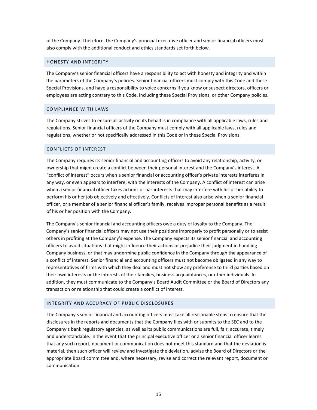 15 of the Company. Therefore, the Company’s principal executive officer and senior financial officers must also comply with the additional conduct and ethics standards set forth below. HONESTY AND INTEGRITY The Company’s senior financial officers have a responsibility to act with honesty and integrity and within the parameters of the Company’s policies. Senior financial officers must comply with this Code and these Special Provisions, and have a responsibility to voice concerns if you know or suspect directors, officers or employees are acting contrary to this Code, including these Special Provisions, or other Company policies. COMPLIANCE WITH LAWS The Company strives to ensure all activity on its behalf is in compliance with all applicable laws, rules and regulations. Senior financial officers of the Company must comply with all applicable laws, rules and regulations, whether or not specifically addressed in this Code or in these Special Provisions. CONFLICTS OF INTEREST The Company requires its senior financial and accounting officers to avoid any relationship, activity, or ownership that might create a conflict between their personal interest and the Company’s interest. A “conflict of interest” occurs when a senior financial or accounting officer’s private interests interferes in any way, or even appears to interfere, with the interests of the Company. A conflict of interest can arise when a senior financial officer takes actions or has interests that may interfere with his or her ability to perform his or her job objectively and effectively. Conflicts of interest also arise when a senior financial officer, or a member of a senior financial officer’s family, receives improper personal benefits as a result of his or her position with the Company. The Company’s senior financial and accounting officers owe a duty of loyalty to the Company. The Company’s senior financial officers may not use their positions improperly to profit personally or to assist others in profiting at the Company’s expense. The Company expects its senior financial and accounting officers to avoid situations that might influence their actions or prejudice their judgment in handling Company business, or that may undermine public confidence in the Company through the appearance of a conflict of interest. Senior financial and accounting officers must not become obligated in any way to representatives of firms with which they deal and must not show any preference to third parties based on their own interests or the interests of their families, business acquaintances, or other individuals. In addition, they must communicate to the Company’s Board Audit Committee or the Board of Directors any transaction or relationship that could create a conflict of interest. INTEGRITY AND ACCURACY OF PUBLIC DISCLOSURES The Company’s senior financial and accounting officers must take all reasonable steps to ensure that the disclosures in the reports and documents that the Company files with or submits to the SEC and to the Company’s bank regulatory agencies, as well as its public communications are full, fair, accurate, timely and understandable. In the event that the principal executive officer or a senior financial officer learns that any such report, document or communication does not meet this standard and that the deviation is material, then such officer will review and investigate the deviation, advise the Board of Directors or the appropriate Board committee and, where necessary, revise and correct the relevant report, document or communication.