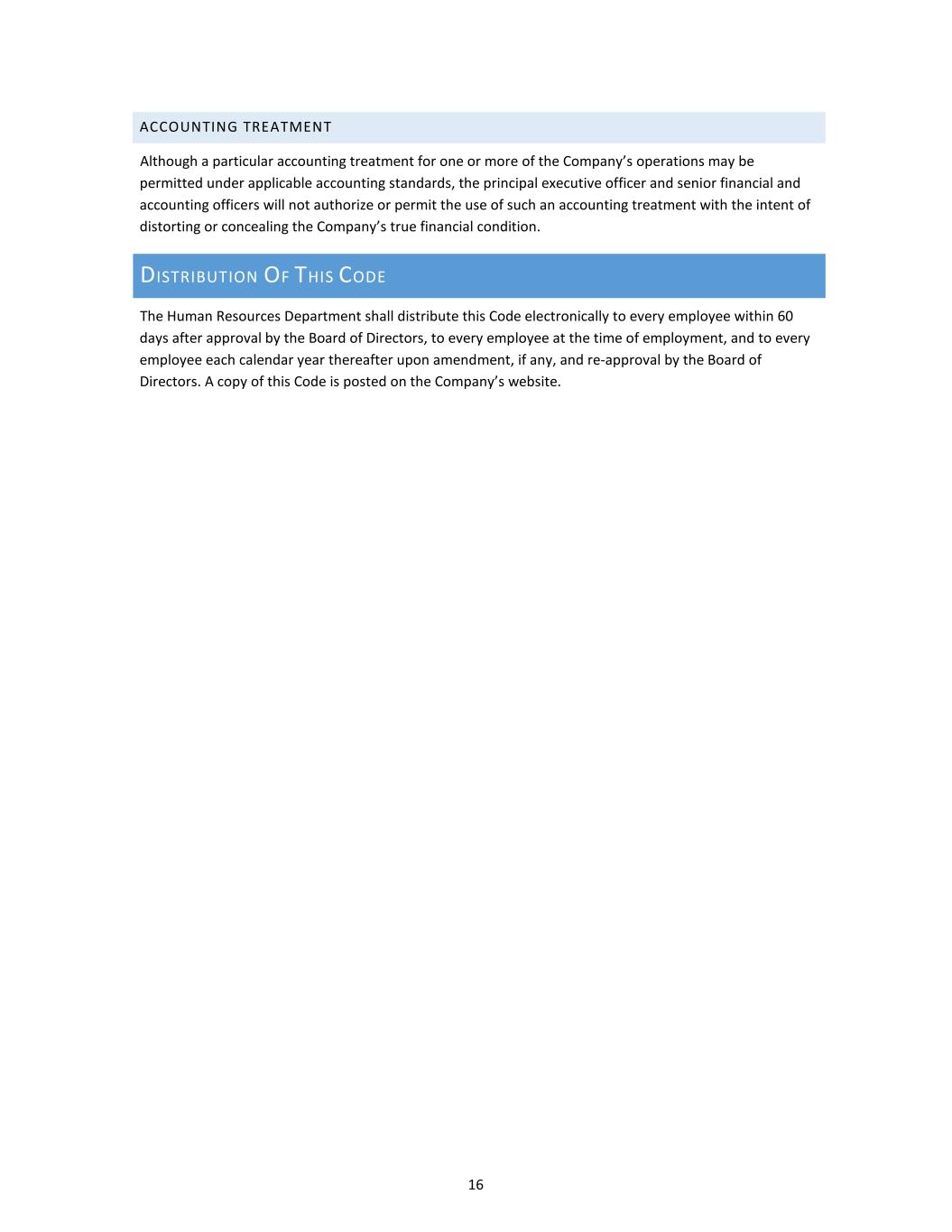 16 ACCOUNTING TREATMENT Although a particular accounting treatment for one or more of the Company’s operations may be permitted under applicable accounting standards, the principal executive officer and senior financial and accounting officers will not authorize or permit the use of such an accounting treatment with the intent of distorting or concealing the Company’s true financial condition. DISTRIBUTION OF THIS CODE The Human Resources Department shall distribute this Code electronically to every employee within 60 days after approval by the Board of Directors, to every employee at the time of employment, and to every employee each calendar year thereafter upon amendment, if any, and re-approval by the Board of Directors. A copy of this Code is posted on the Company’s website.