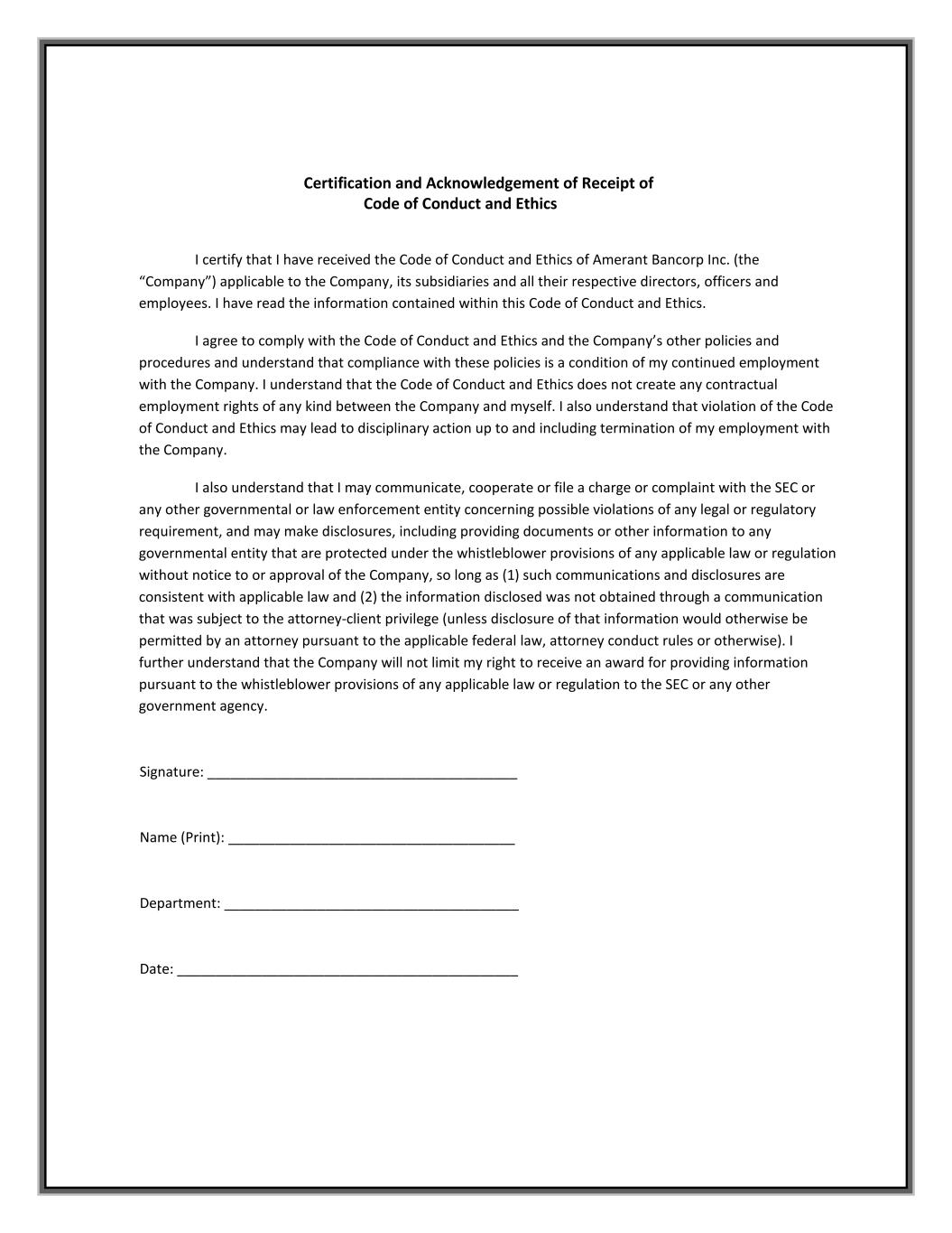 Certification and Acknowledgement of Receipt of Code of Conduct and Ethics I certify that I have received the Code of Conduct and Ethics of Amerant Bancorp Inc. (the “Company”) applicable to the Company, its subsidiaries and all their respective directors, officers and employees. I have read the information contained within this Code of Conduct and Ethics. I agree to comply with the Code of Conduct and Ethics and the Company’s other policies and procedures and understand that compliance with these policies is a condition of my continued employment with the Company. I understand that the Code of Conduct and Ethics does not create any contractual employment rights of any kind between the Company and myself. I also understand that violation of the Code of Conduct and Ethics may lead to disciplinary action up to and including termination of my employment with the Company. I also understand that I may communicate, cooperate or file a charge or complaint with the SEC or any other governmental or law enforcement entity concerning possible violations of any legal or regulatory requirement, and may make disclosures, including providing documents or other information to any governmental entity that are protected under the whistleblower provisions of any applicable law or regulation without notice to or approval of the Company, so long as (1) such communications and disclosures are consistent with applicable law and (2) the information disclosed was not obtained through a communication that was subject to the attorney-client privilege (unless disclosure of that information would otherwise be permitted by an attorney pursuant to the applicable federal law, attorney conduct rules or otherwise). I further understand that the Company will not limit my right to receive an award for providing information pursuant to the whistleblower provisions of any applicable law or regulation to the SEC or any other government agency. Signature: ________________________________________ Name (Print): _____________________________________ Department: ______________________________________ Date: ____________________________________________