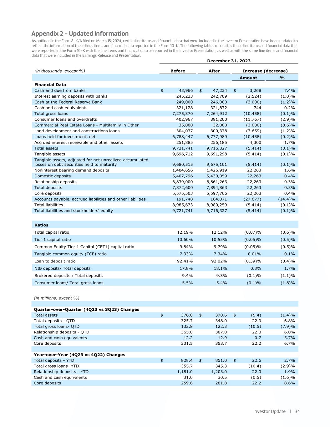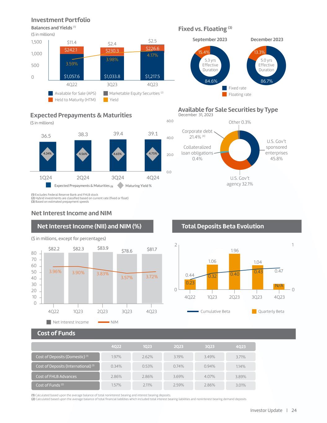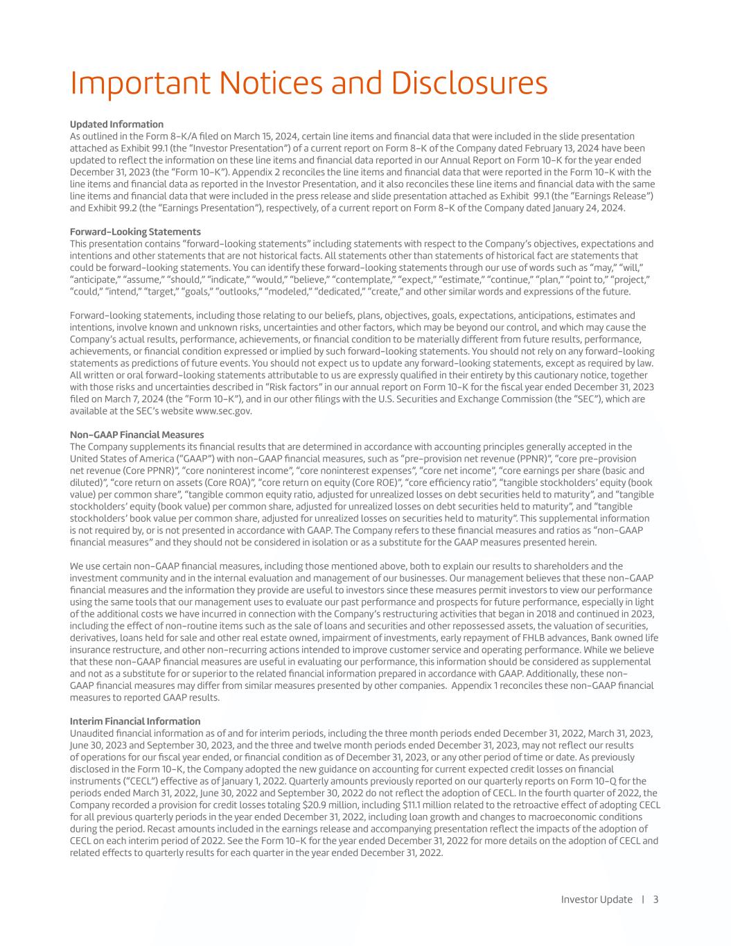 Important Notices and Disclosures Updated Information As outlined in the Form 8-K/A filed on March 15, 2024, certain line items and financial data that were included in the slide presentation attached as Exhibit 99.1 (the “Investor Presentation”) of a current report on Form 8-K of the Company dated February 13, 2024 have been updated to reflect the information on these line items and financial data reported in our Annual Report on Form 10-K for the year ended December 31, 2023 (the “Form 10-K”). Appendix 2 reconciles the line items and financial data that were reported in the Form 10-K with the line items and financial data as reported in the Investor Presentation, and it also reconciles these line items and financial data with the same line items and financial data that were included in the press release and slide presentation attached as Exhibit 99.1 (the “Earnings Release”) and Exhibit 99.2 (the “Earnings Presentation”), respectively, of a current report on Form 8-K of the Company dated January 24, 2024. Forward-Looking Statements This presentation contains “forward-looking statements” including statements with respect to the Company’s objectives, expectations and intentions and other statements that are not historical facts. All statements other than statements of historical fact are statements that could be forward-looking statements. You can identify these forward-looking statements through our use of words such as “may,” “will,” “anticipate,” “assume,” “should,” “indicate,” “would,” “believe,” “contemplate,” “expect,” “estimate,” “continue,” “plan,” “point to,” “project,” “could,” “intend,” “target,” “goals,” “outlooks,” “modeled,” “dedicated,” “create,” and other similar words and expressions of the future. Forward-looking statements, including those relating to our beliefs, plans, objectives, goals, expectations, anticipations, estimates and intentions, involve known and unknown risks, uncertainties and other factors, which may be beyond our control, and which may cause the Company’s actual results, performance, achievements, or financial condition to be materially different from future results, performance, achievements, or financial condition expressed or implied by such forward-looking statements. You should not rely on any forward-looking statements as predictions of future events. You should not expect us to update any forward-looking statements, except as required by law. All written or oral forward-looking statements attributable to us are expressly qualified in their entirety by this cautionary notice, together with those risks and uncertainties described in “Risk factors” in our annual report on Form 10-K for the fiscal year ended December 31, 2023 filed on March 7, 2024 (the “Form 10-K”), and in our other filings with the U.S. Securities and Exchange Commission (the “SEC”), which are available at the SEC’s website www.sec.gov. Non-GAAP Financial Measures The Company supplements its financial results that are determined in accordance with accounting principles generally accepted in the United States of America (“GAAP”) with non-GAAP financial measures, such as “pre-provision net revenue (PPNR)”, “core pre-provision net revenue (Core PPNR)”, “core noninterest income”, “core noninterest expenses”, “core net income”, “core earnings per share (basic and diluted)”, “core return on assets (Core ROA)”, “core return on equity (Core ROE)”, “core efficiency ratio”, “tangible stockholders’ equity (book value) per common share”, “tangible common equity ratio, adjusted for unrealized losses on debt securities held to maturity”, and “tangible stockholders’ equity (book value) per common share, adjusted for unrealized losses on debt securities held to maturity”, and “tangible stockholders’ book value per common share, adjusted for unrealized losses on securities held to maturity”. This supplemental information is not required by, or is not presented in accordance with GAAP. The Company refers to these financial measures and ratios as “non-GAAP financial measures” and they should not be considered in isolation or as a substitute for the GAAP measures presented herein. We use certain non-GAAP financial measures, including those mentioned above, both to explain our results to shareholders and the investment community and in the internal evaluation and management of our businesses. Our management believes that these non-GAAP financial measures and the information they provide are useful to investors since these measures permit investors to view our performance using the same tools that our management uses to evaluate our past performance and prospects for future performance, especially in light of the additional costs we have incurred in connection with the Company’s restructuring activities that began in 2018 and continued in 2023, including the effect of non-routine items such as the sale of loans and securities and other repossessed assets, the valuation of securities, derivatives, loans held for sale and other real estate owned, impairment of investments, early repayment of FHLB advances, Bank owned life insurance restructure, and other non-recurring actions intended to improve customer service and operating performance. While we believe that these non-GAAP financial measures are useful in evaluating our performance, this information should be considered as supplemental and not as a substitute for or superior to the related financial information prepared in accordance with GAAP. Additionally, these non- GAAP financial measures may differ from similar measures presented by other companies. Appendix 1 reconciles these non-GAAP financial measures to reported GAAP results. Interim Financial Information Unaudited financial information as of and for interim periods, including the three month 