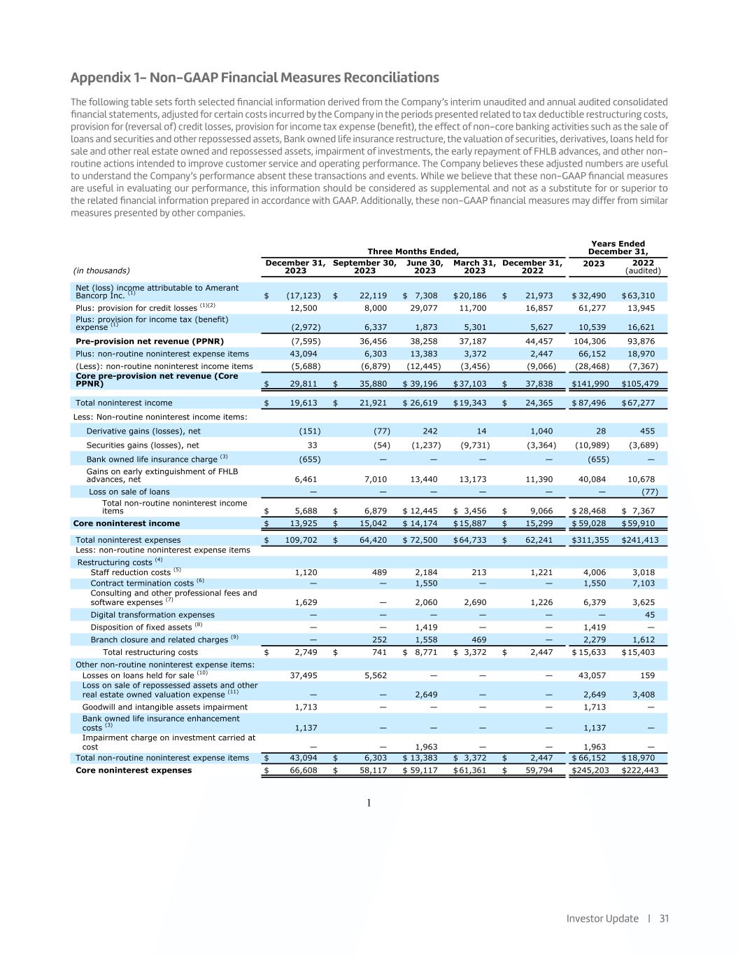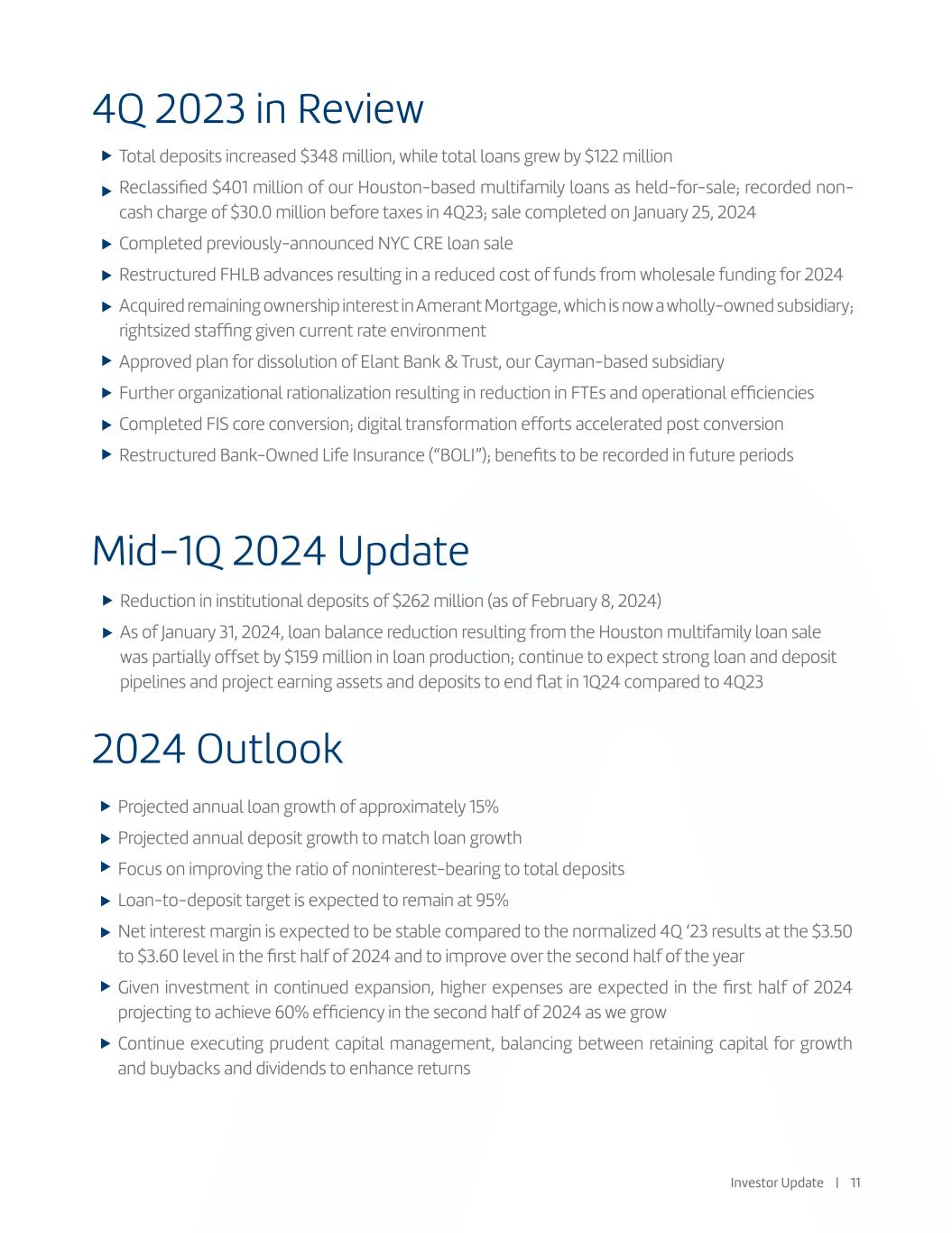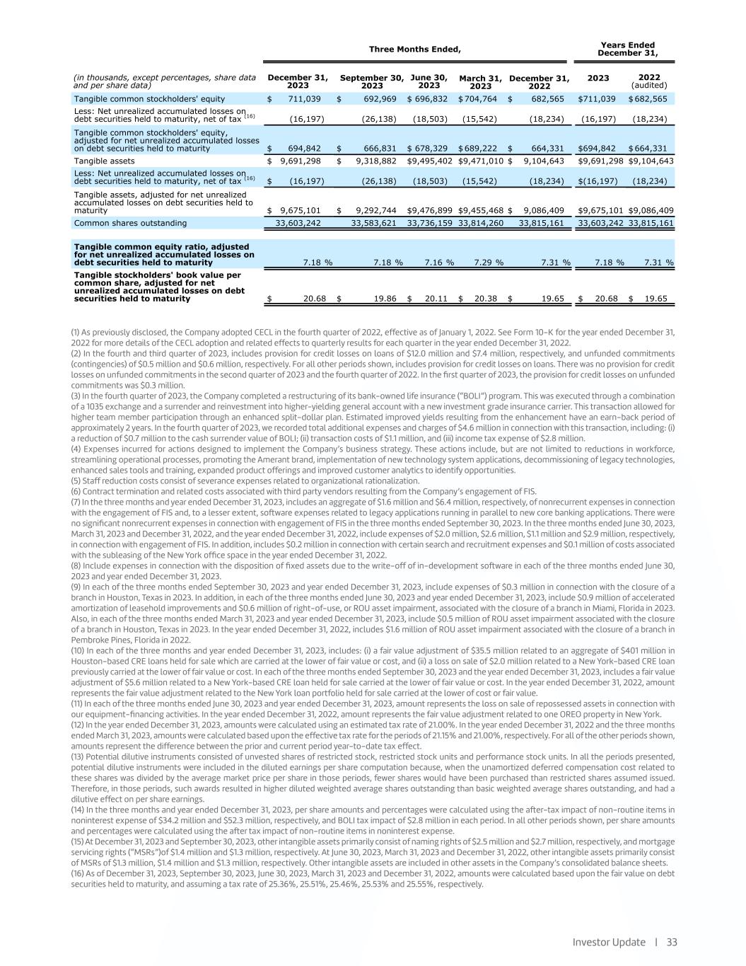 Important Notices and Disclosures Updated Information As outlined in the Form 8-K/A filed on March 15, 2024, certain line items and financial data that were included in the slide presentation attached as Exhibit 99.1 (the “Investor Presentation”) of a current report on Form 8-K of the Company dated February 13, 2024 have been updated to reflect the information on these line items and financial data reported in our Annual Report on Form 10-K for the year ended December 31, 2023 (the “Form 10-K”). Appendix 2 reconciles the line items and financial data that were reported in the Form 10-K with the line items and financial data as reported in the Investor Presentation, and it also reconciles these line items and financial data with the same line items and financial data that were included in the press release and slide presentation attached as Exhibit 99.1 (the “Earnings Release”) and Exhibit 99.2 (the “Earnings Presentation”), respectively, of a current report on Form 8-K of the Company dated January 24, 2024. Forward-Looking Statements This presentation contains “forward-looking statements” including statements with respect to the Company’s objectives, expectations and intentions and other statements that are not historical facts. All statements other than statements of historical fact are statements that could be forward-looking statements. You can identify these forward-looking statements through our use of words such as “may,” “will,” “anticipate,” “assume,” “should,” “indicate,” “would,” “believe,” “contemplate,” “expect,” “estimate,” “continue,” “plan,” “point to,” “project,” “could,” “intend,” “target,” “goals,” “outlooks,” “modeled,” “dedicated,” “create,” and other similar words and expressions of the future. Forward-looking statements, including those relating to our beliefs, plans, objectives, goals, expectations, anticipations, estimates and intentions, involve known and unknown risks, uncertainties and other factors, which may be beyond our control, and which may cause the Company’s actual results, performance, achievements, or financial condition to be materially different from future results, performance, achievements, or financial condition expressed or implied by such forward-looking statements. You should not rely on any forward-looking statements as predictions of future events. You should not expect us to update any forward-looking statements, except as required by law. All written or oral forward-looking statements attributable to us are expressly qualified in their entirety by this cautionary notice, together with those risks and uncertainties described in “Risk factors” in our annual report on Form 10-K for the fiscal year ended December 31, 2023 filed on March 7, 2024 (the “Form 10-K”), and in our other filings with the U.S. Securities and Exchange Commission (the “SEC”), which are available at the SEC’s website www.sec.gov. Non-GAAP Financial Measures The Company supplements its financial results that are determined in accordance with accounting principles generally accepted in the United States of America (“GAAP”) with non-GAAP financial measures, such as “pre-provision net revenue (PPNR)”, “core pre-provision net revenue (Core PPNR)”, “core noninterest income”, “core noninterest expenses”, “core net income”, “core earnings per share (basic and diluted)”, “core return on assets (Core ROA)”, “core return on equity (Core ROE)”, “core efficiency ratio”, “tangible stockholders’ equity (book value) per common share”, “tangible common equity ratio, adjusted for unrealized losses on debt securities held to maturity”, and “tangible stockholders’ equity (book value) per common share, adjusted for unrealized losses on debt securities held to maturity”, and “tangible stockholders’ book value per common share, adjusted for unrealized losses on securities held to maturity”. This supplemental information is not required by, or is not presented in accordance with GAAP. The Company refers to these financial measures and ratios as “non-GAAP financial measures” and they should not be considered in isolation or as a substitute for the GAAP measures presented herein. We use certain non-GAAP financial measures, including those mentioned above, both to explain our results to shareholders and the investment community and in the internal evaluation and management of our businesses. Our management believes that these non-GAAP financial measures and the information they provide are useful to investors since these measures permit investors to view our performance using the same tools that our management uses to evaluate our past performance and prospects for future performance, especially in light of the additional costs we have incurred in connection with the Company’s restructuring activities that began in 2018 and continued in 2023, including the effect of non-routine items such as the sale of loans and securities and other repossessed assets, the valuation of securities, derivatives, loans held for sale and other real estate owned, impairment of investments, early repayment of FHLB advances, Bank owned life insurance restructure, and other non-recurring actions intended to improve customer service and operating performance. While we believe that these non-GAAP financial measures are useful in evaluating our performance, this information should be considered as supplemental and not as a substitute for or superior to the related financial information prepared in accordance with GAAP. Additionally, these non- GAAP financial measures may differ from similar measures presented by other companies. Appendix 1 reconciles these non-GAAP financial measures to reported GAAP results. Interim Financial Information Unaudited financial information as of and for interim periods, including the three month 