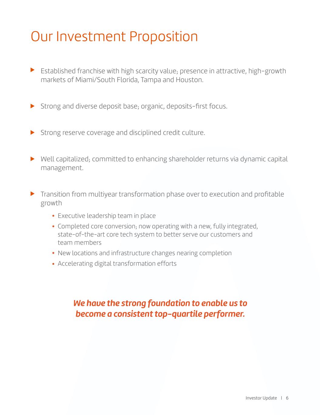 Our Investment Proposition Established franchise with high scarcity value; presence in attractive, high-growth markets of Miami/South Florida, Tampa and Houston. Strong and diverse deposit base; organic, deposits-first focus. Strong reserve coverage and disciplined credit culture. Well capitalized; committed to enhancing shareholder returns via dynamic capital management. Transition from multiyear transformation phase over to execution and profitable growth Investor Update | 6 Executive leadership team in place Completed core conversion; now operating with a new, fully integrated, state-of-the-art core tech system to better serve our customers and team members New locations and infrastructure changes nearing completion Accelerating digital transformation efforts We have the strong foundation to enable us to become a consistent top-quartile performer.