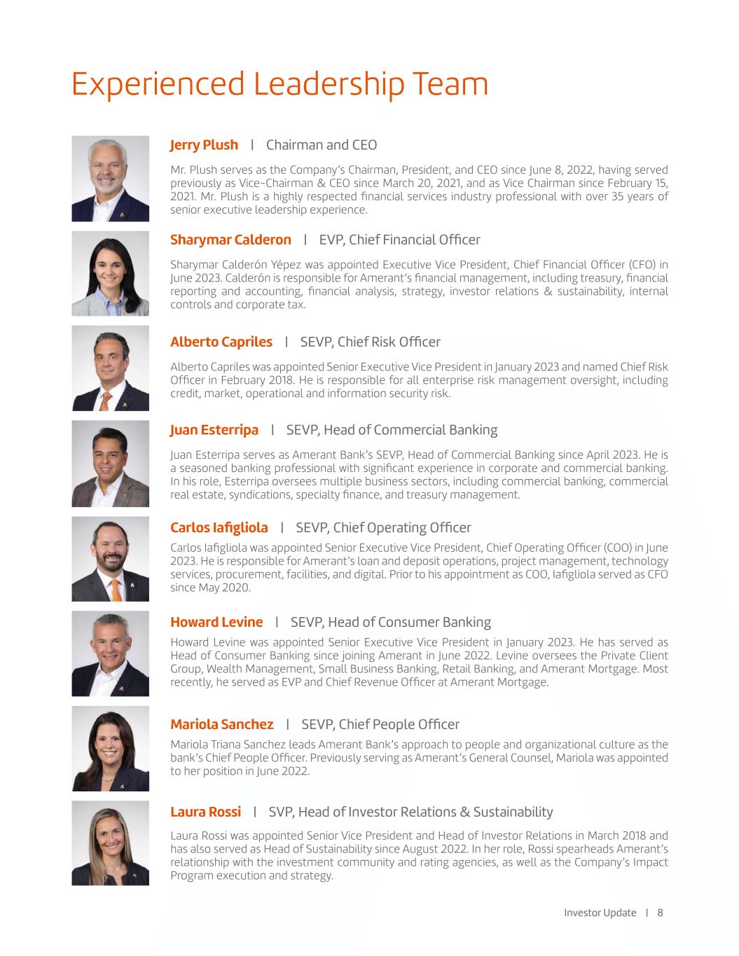 Experienced Leadership Team Jerry Plush | Chairman and CEO Mr. Plush serves as the Company’s Chairman, President, and CEO since June 8, 2022, having served previously as Vice-Chairman & CEO since March 20, 2021, and as Vice Chairman since February 15, 2021. Mr. Plush is a highly respected financial services industry professional with over 35 years of senior executive leadership experience. Sharymar Calderon | EVP, Chief Financial Officer Sharymar Calderón Yépez was appointed Executive Vice President, Chief Financial Officer (CFO) in June 2023. Calderón is responsible for Amerant’s financial management, including treasury, financial reporting and accounting, financial analysis, strategy, investor relations & sustainability, internal controls and corporate tax. Alberto Capriles | SEVP, Chief Risk Officer Alberto Capriles was appointed Senior Executive Vice President in January 2023 and named Chief Risk Officer in February 2018. He is responsible for all enterprise risk management oversight, including credit, market, operational and information security risk. Juan Esterripa | SEVP, Head of Commercial Banking Juan Esterripa serves as Amerant Bank’s SEVP, Head of Commercial Banking since April 2023. He is a seasoned banking professional with significant experience in corporate and commercial banking. In his role, Esterripa oversees multiple business sectors, including commercial banking, commercial real estate, syndications, specialty finance, and treasury management. Carlos Iafigliola | SEVP, Chief Operating Officer Carlos Iafigliola was appointed Senior Executive Vice President, Chief Operating Officer (COO) in June 2023. He is responsible for Amerant’s loan and deposit operations, project management, technology services, procurement, facilities, and digital. Prior to his appointment as COO, Iafigliola served as CFO since May 2020. Howard Levine | SEVP, Head of Consumer Banking Howard Levine was appointed Senior Executive Vice President in January 2023. He has served as Head of Consumer Banking since joining Amerant in June 2022. Levine oversees the Private Client Group, Wealth Management, Small Business Banking, Retail Banking, and Amerant Mortgage. Most recently, he served as EVP and Chief Revenue Officer at Amerant Mortgage. Mariola Sanchez | SEVP, Chief People Officer Mariola Triana Sanchez leads Amerant Bank’s approach to people and organizational culture as the bank’s Chief People Officer. Previously serving as Amerant’s General Counsel, Mariola was appointed to her position in June 2022. Laura Rossi | SVP, Head of Investor Relations & Sustainability Laura Rossi was appointed Senior Vice President and Head of Investor Relations in March 2018 and has also served as Head of Sustainability since August 2022. In her role, Rossi spearheads Amerant’s relationship with the investment community and rating agencies, as well as the Company’s Impact Program execution and strategy. Investor Update | 8
