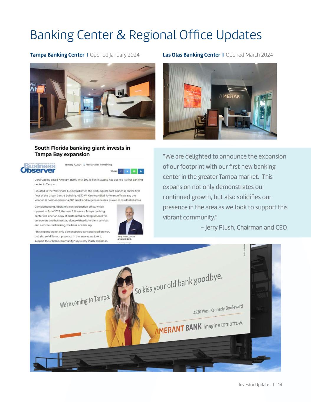 The Amerant Brand Evolution 2024 Imagine Tomorrow Campaign We have identified an opportunity to enhance our 2021 Imagine Campaign by aligning it with the underlying reasons our customers should choose Amerant for their banking needs. Shifting from a functional to an emotive approach. Obtaining a business loan now signifies the realization of your entrepreneurial dreams and starting a savings fund for your wedding translates to a joyous “happily ever after” with your partner. Life. You can mark it as an endless parade of choices being made. There’s a few that’ll stay with us for a lifetime, like a name. And a whole lot that’ll seem insignificant, like chocolate or vanilla, coleslaw or fries. And then, there are the big ones. The life-changing ones. The ones that’ll wake us in the middle of the night just to remind us of the enormous weight in every single one. These are the choices all our dreams and plans are built on. So choose wisely today, and imagine what can be tomorrow. Investor Update | 13