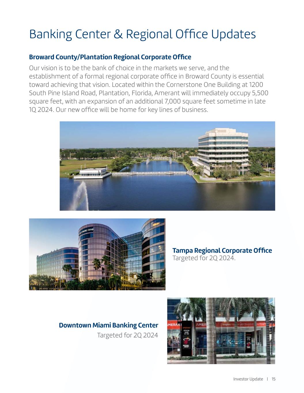 Banking Center & Regional Office Updates Broward County/Plantation Regional Corporate Office Our vision is to be the bank of choice in the markets we serve, and the establishment of a formal regional corporate office in Broward County is essential toward achieving that vision. Located within the Cornerstone One Building at 1200 South Pine Island Road, Plantation, Florida, Amerant will immediately occupy 5,500 square feet, with an expansion of an additional 7,000 square feet sometime in late 1Q 2024. Our new office will be home for key lines of business. Tampa Regional Corporate Office Targeted for 2Q 2024. Investor Update | 15 Downtown Miami Banking Center Targeted for 2Q 2024