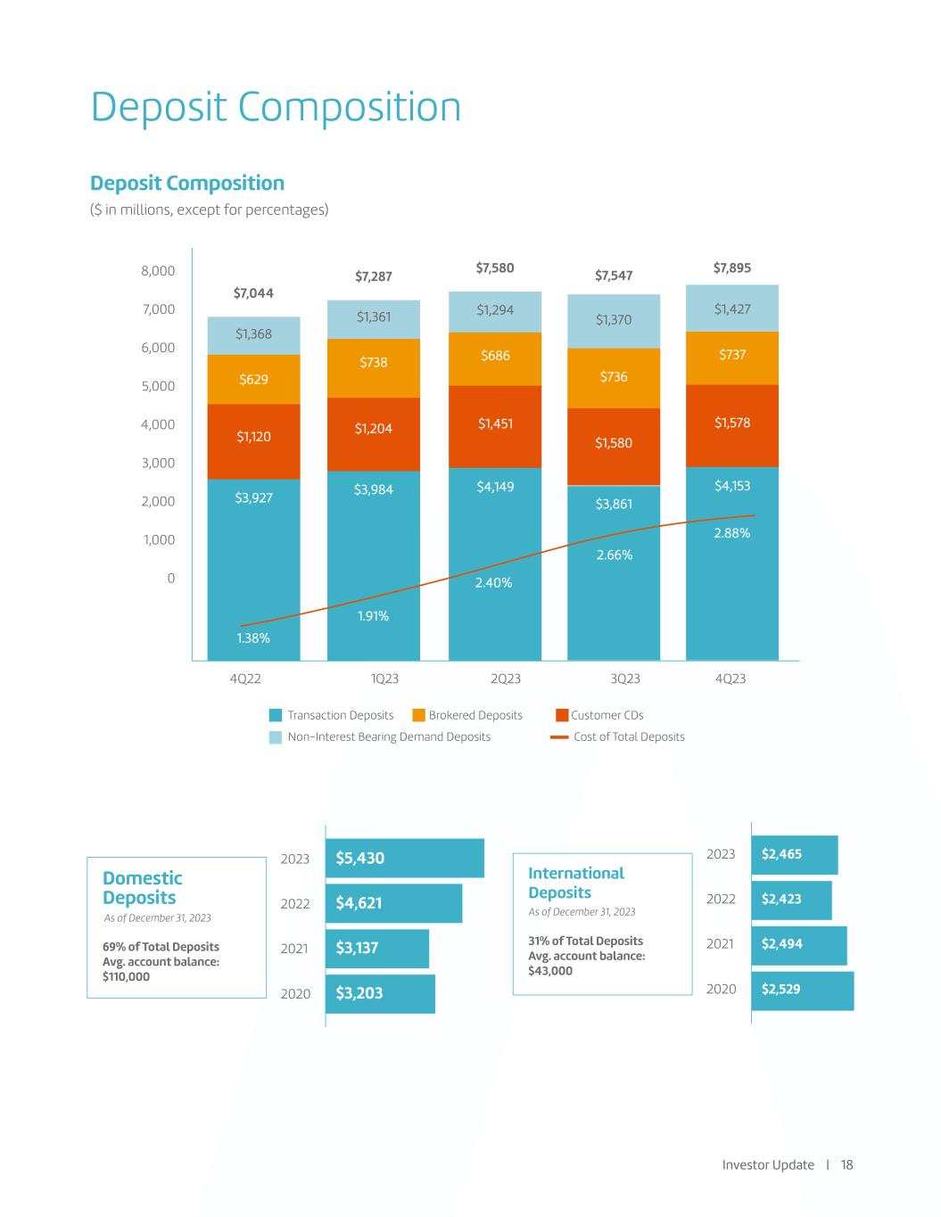 Deposit Composition Deposit Composition ($ in millions, except for percentages) Transaction Deposits Brokered Deposits Customer CDs Non-Interest Bearing Demand Deposits Cost of Total Deposits International Deposits 31% of Total Deposits Avg. account balance: $43,000 2023 $2,4652023 $5,430 2022 $2,4232022 $4,621 2021 $2,4942021 $3,137 4Q22 1Q23 2Q23 3Q23 4Q23 $1,368 $1,361 $1,294 $7,044 $7,287 $7,5808,000 7,000 6,000 5,000 4,000 3,000 2,000 1,000 0 2020 $2,5292020 $3,203 Domestic Deposits 69% of Total Deposits Avg. account balance: $110,000 1.38% 1.91% 2.40% $629 $1,120 $3,927 $738 $1,204 $3,984 $686 $1,451 $4,149 $1,370 $7,547 2.66% $736 $1,580 $3,861 Investor Update | 18 $1,427 $7,895 2.88% $737 $1,578 $4,153 As of December 31, 2023 As of December 31, 2023