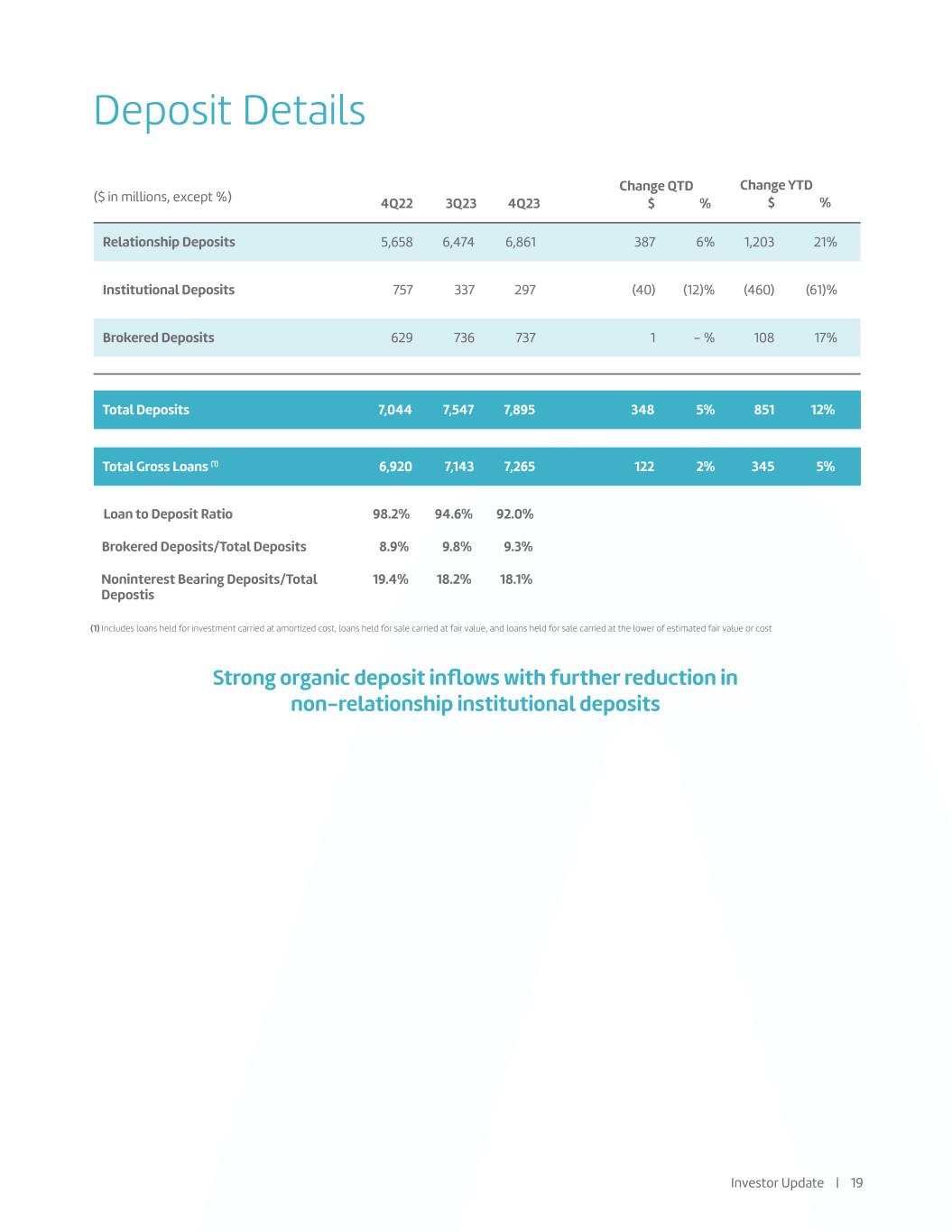 Deposit Details Strong organic deposit inflows with further reduction in non-relationship institutional deposits Relationship Deposits Institutional Deposits Brokered Deposits 4Q22 3Q23 4Q23 Change QTD 5,658 6,474 6,861 387 6% 1,203 21% 757 337 297 (40) (12)% (460) (61)% 629 736 737 1 - % 108 17% (1) Includes loans held for investment carried at amortized cost, loans held for sale carried at fair value, and loans held for sale carried at the lower of estimated fair value or cost Total Deposits 7,044 7,547 7,895 348 5% Total Gross Loans (1) 6,920 7,143 7,265 122 2% Loan to Deposit Ratio 98.2% 94.6% 92.0% Brokered Deposits/Total Deposits 8.9% 9.8% 9.3% Noninterest Bearing Deposits/Total Depostis 19.4% 18.2% 18.1% $ % Change YTD $ % 851 12% 345 5% ($ in millions, except %) Investor Update | 19