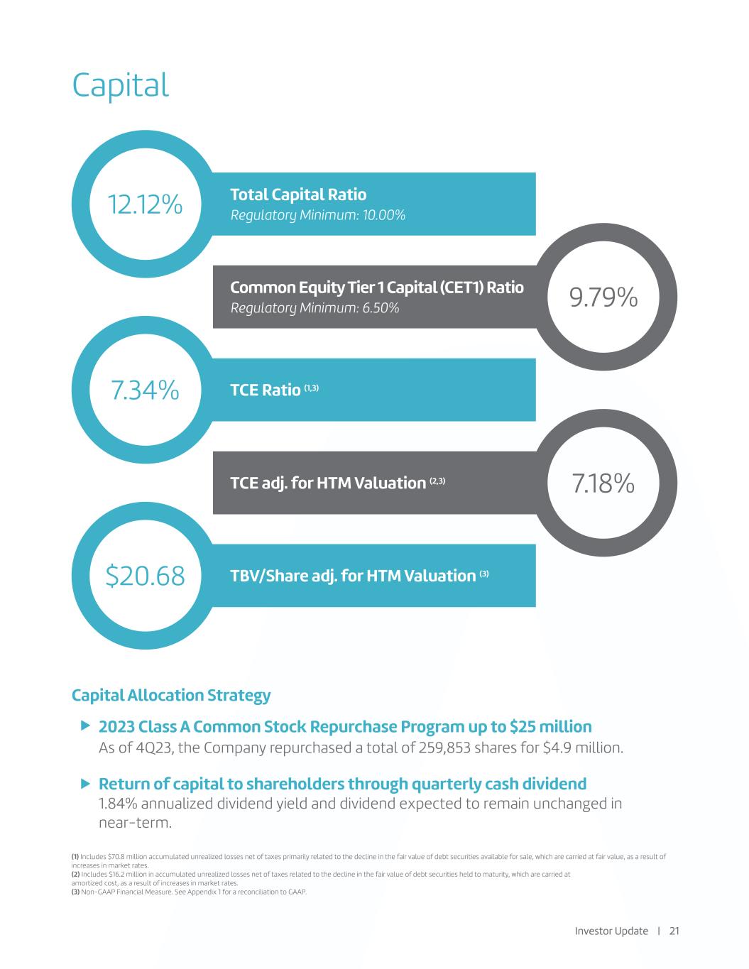 Capital 12.12% 7.34% 9.79% 7.18% $20.68 Total Capital Ratio Regulatory Minimum: 10.00% Common Equity Tier 1 Capital (CET1) Ratio Regulatory Minimum: 6.50% TCE Ratio (1,3) TCE adj. for HTM Valuation (2,3) TBV/Share adj. for HTM Valuation (3) Capital Allocation Strategy 2023 Class A Common Stock Repurchase Program up to $25 million As of 4Q23, the Company repurchased a total of 259,853 shares for $4.9 million. Return of capital to shareholders through quarterly cash dividend 1.84% annualized dividend yield and dividend expected to remain unchanged in near-term. (1) Includes $70.8 million accumulated unrealized losses net of taxes primarily related to the decline in the fair value of debt securities available for sale, which are carried at fair value, as a result of increases in market rates. (2) Includes $16.2 million in accumulated unrealized losses net of taxes related to the decline in the fair value of debt securities held to maturity, which are carried at amortized cost, as a result of increases in market rates. (3) Non-GAAP Financial Measure. See Appendix 1 for a reconciliation to GAAP. Investor Update | 21
