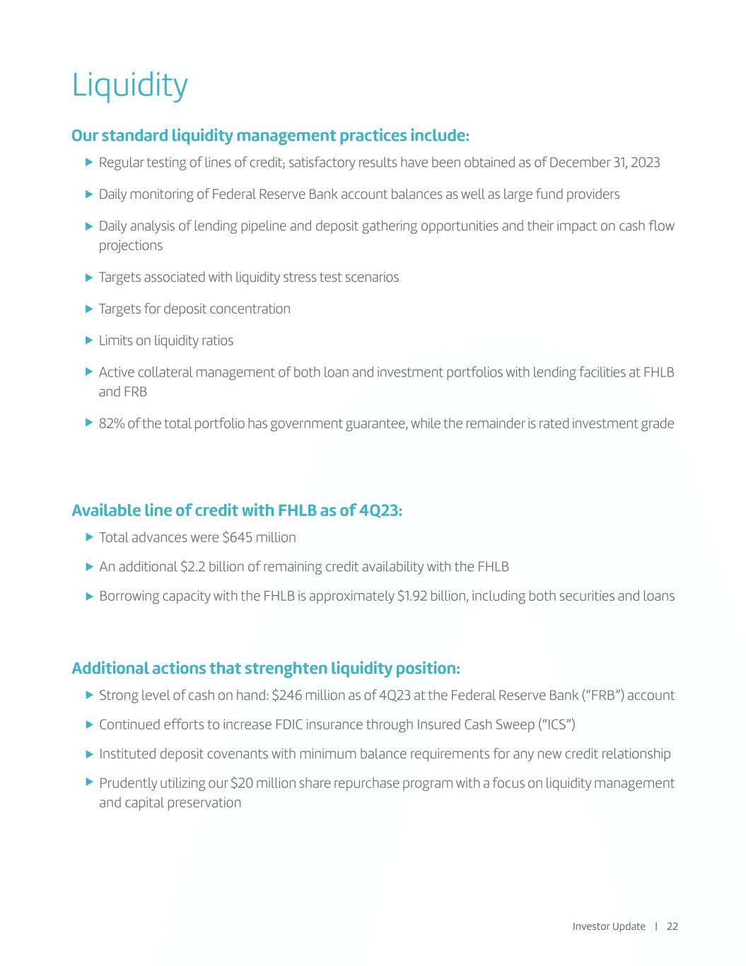 Liquidity Regular testing of lines of credit; satisfactory results have been obtained as of December 31, 2023 Daily monitoring of Federal Reserve Bank account balances as well as large fund providers Daily analysis of lending pipeline and deposit gathering opportunities and their impact on cash flow projections Targets associated with liquidity stress test scenarios Targets for deposit concentration Limits on liquidity ratios Active collateral management of both loan and investment portfolios with lending facilities at FHLB and FRB 82% of the total portfolio has government guarantee, while the remainder is rated investment grade Total advances were $645 million An additional $2.2 billion of remaining credit availability with the FHLB Borrowing capacity with the FHLB is approximately $1.92 billion, including both securities and loans Strong level of cash on hand: $246 million as of 4Q23 at the Federal Reserve Bank (“FRB”) account Continued efforts to increase FDIC insurance through Insured Cash Sweep (“ICS”) Instituted deposit covenants with minimum balance requirements for any new credit relationship Prudently utilizing our $20 million share repurchase program with a focus on liquidity management and capital preservation Our standard liquidity management practices include: Available line of credit with FHLB as of 4Q23: Additional actions that strenghten liquidity position: Investor Update | 22
