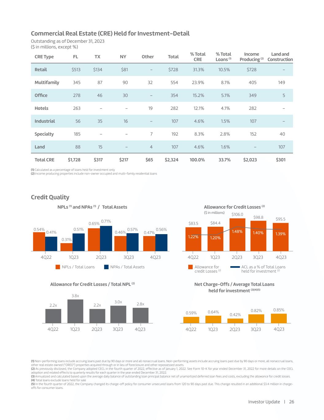 Commercial Real Estate (CRE) Held for Investment-Detail Credit Quality Outstanding as of December 31, 2023 ($ in millions, except %) (1) Calculated as a percentage of loans held for investment only (2) Income producing properties include non-owner occupied and multi-family residential loans CRE Type Retail Multifamily Office Industrial Hotels Specialty Total CRE Land FL TX NY Other Total % Total CRE % Total Loans (1) Income Producing (2) Land and Construction $513 $134 $81 - $728 31.3% 10.5% $728 - 345 87 90 32 554 23.9% 8.1% 405 149 278 46 30 – 354 15.2% 5.1% 349 5 263 – – 19 282 12.1% 4.1% 282 – 56 35 16 – 107 4.6% 1.5% 107 – 185 – – 7 192 8.3% 2.8% 152 40 88 15 – 4 107 4.6% 1.6% – 107 $1,728 $317 $217 $65 $2,324 100.0% 33.7% $2,023 $301 (1) Non-performing loans include accruing loans past due by 90 days or more and all nonaccrual loans. Non-performing assets include accruing loans past due by 90 days or more, all nonaccrual loans, other real estate owned (“OREO”) properties acquired through or in lieu of foreclosure and other repossessed assets. (2) As previously disclosed, the Company adopted CECL in the fourth quarter of 2022, effective as of January 1, 2022. See Form 10-K for year ended December 31, 2022 for more details on the CECL adoption and related effects to quarterly results for each quarter in the year ended December 31, 2022. (3) Annualized and calculated based upon the average daily balance of outstanding loan principal balance net of unamortized deferred loan fees and costs, excluding the allowance for credit losses. (4) Total loans exclude loans held for sale (5) In the fourth quarter of 2022, the Company changed its charge-off policy for consumer unsecured loans from 120 to 90 days past due. This change resulted in an additional $3.4 million in charge- offs for consumer loans. 4Q23 3Q23 3Q23 3Q23 0.46% 0.31% 0.51% 0.65% 0.71% $98.8 3.0x 0.82% $83.5 2.2x 0.59% $84.4 3.8x 0.64% $106.0 2.2x 0.42% 0.41% 0.54% 0.57% 4Q22 4Q23 4Q23 4Q23 1Q23 4Q22 4Q22 4Q22 2Q23 1Q23 1Q23 1Q23 3Q23 2Q23 2Q23 2Q23 ($ in millions) NPLs (1) and NPAs (1) / Total Assets Allowance for Credit Losses / Total NPL (2) Allowance for Credit Losses (2) Net Charge-Offs / Average Total Loans held for investment (3)(4)(5) NPLs / Total Loans NPAs / Total Assets Allowance for credit Losses (2) ACL as a % of Total Loans held for investment (2) 1.40% 1.22% 1.20% 1.48% Investor Update | 26 0.47% 0.56% $95.5 1.39% 2.8x 0.85%