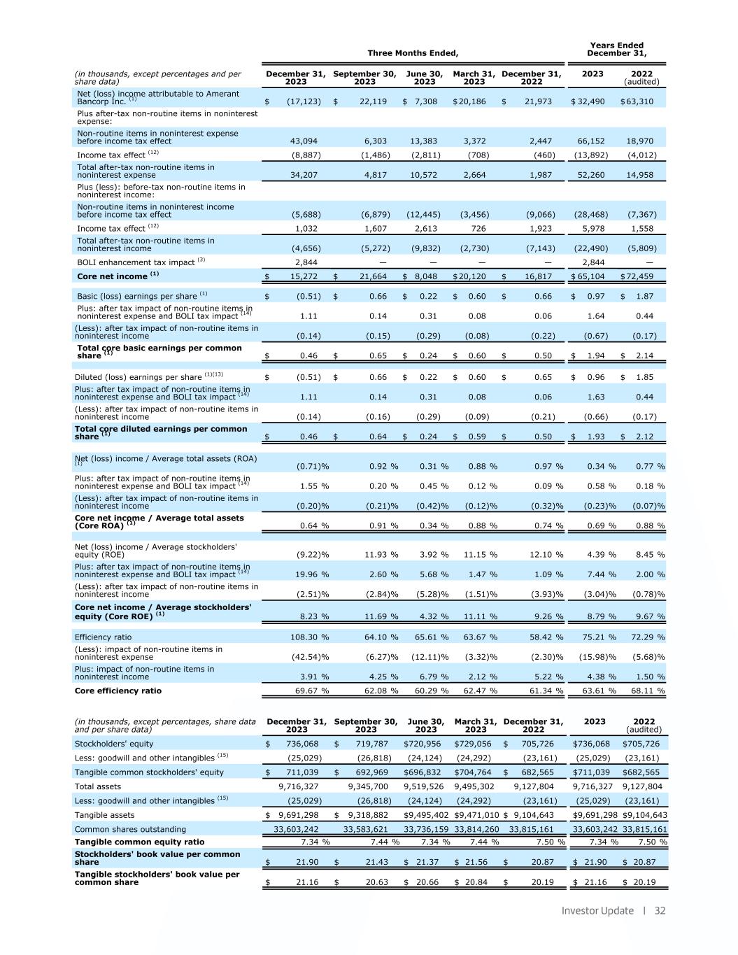 Investor Update | 33 (1) As previously disclosed, the Company adopted CECL in the fourth quarter of 2022, effective as of January 1, 2022. See Form 10-K for the year ended December 31, 2022 for more details of the CECL adoption and related effects to quarterly results for each quarter in the year ended December 31, 2022. (2) In the fourth and third quarter of 2023, includes provision for credit losses on loans of $12.0 million and $7.4 million, respectively, and unfunded commitments (contingencies) of $0.5 million and $0.6 million, respectively. For all other periods shown, includes provision for credit losses on loans. There was no provision for credit losses on unfunded commitments in the second quarter of 2023 and the fourth quarter of 2022. In the first quarter of 2023, the provision for credit losses on unfunded commitments was $0.3 million. (3) In the fourth quarter of 2023, the Company completed a restructuring of its bank-owned life insurance (“BOLI”) program. This was executed through a combination of a 1035 exchange and a surrender and reinvestment into higher-yielding general account with a new investment grade insurance carrier. This transaction allowed for higher team member participation through an enhanced split-dollar plan. Estimated improved yields resulting from the enhancement have an earn-back period of approximately 2 years. In the fourth quarter of 2023, we recorded total additional expenses and charges of $4.6 million in connection with this transaction, including: (i) a reduction of $0.7 million to the cash surrender value of BOLI; (ii) transaction costs of $1.1 million, and (iii) income tax expense of $2.8 million. (4) Expenses incurred for actions designed to implement the Company’s business strategy. These actions include, but are not limited to reductions in workforce, streamlining operational processes, promoting the Amerant brand, implementation of new technology system applications, decommissioning of legacy technologies, enhanced sales tools and training, expanded product offerings and improved customer analytics to identify opportunities. (5) Staff reduction costs consist of severance expenses related to organizational rationalization. (6) Contract termination and related costs associated with third party vendors resulting from the Company’s engagement of FIS. (7) In the three months and year ended December 31, 2023, includes an aggregate of $1.6 million and $6.4 million, respectively, of nonrecurrent expenses in connection with the engagement of FIS and, to a lesser extent, software expenses related to legacy applications running in parallel to new core banking applications. There were no significant nonrecurrent expenses in connection with engagement of FIS in the three months ended September 30, 2023. In the three months ended June 30, 2023, March 31, 2023 and December 31, 2022, and the year ended December 31, 2022, include expenses of $2.0 million, $2.6 million, $1.1 million and $2.9 million, respectively, in connection with engagement of FIS. In addition, includes $0.2 million in connection with certain search and recruitment expenses and $0.1 million of costs associated with the subleasing of the New York office space in the year ended December 31, 2022. (8) Include expenses in connection with the disposition of fixed assets due to the write-off of in-development software in each of the three months ended June 30, 2023 and year ended December 31, 2023. (9) In each of the three months ended September 30, 2023 and year ended December 31, 2023, include expenses of $0.3 million in connection with the closure of a branch in Houston, Texas in 2023. In addition, in each of the three months ended June 30, 2023 and year ended December 31, 2023, include $0.9 million of accelerated amortization of leasehold improvements and $0.6 million of right-of-use, or ROU asset impairment, associated with the closure of a branch in Miami, Florida in 2023. Also, in each of the three months ended March 31, 2023 and year ended December 31, 2023, include $0.5 million of ROU asset impairment associated with the closure of a branch in Houston, Texas in 2023. In the year ended December 31, 2022, includes $1.6 million of ROU asset impairment associated with the closure of a branch in Pembroke Pines, Florida in 2022. (10) In each of the three months and year ended December 31, 2023, includes: (i) a fair value adjustment of $35.5 million related to an aggregate of $401 million in Houston-based CRE loans held for sale which are carried at the lower of fair value or cost, and (ii) a loss on sale of $2.0 million related to a New York-based CRE loan previously carried at the lower of fair value or cost. In each of the three months ended September 30, 2023 and the year ended December 31, 2023, includes a fair value adjustment of $5.6 million related to a New York-based CRE loan held for sale carried at the lower of fair value or cost. In the year ended December 31, 2022, amount represents the fair value adjustment related to the New York loan portfolio held for sale carried at the lower of cost or fair value. (11) In each of the three months ended June 30, 2023 and year ended December 31, 2023, amount represents the loss on sale of repossessed assets in connection with our equipment-financing activities. In the year ended December 31, 2022, amount represents the fair value adjustment related to one OREO property in New York. (12) In the year ended December 31, 2023, amounts were calculated using an estimated tax rate of 21.00%. In the year ended December 31, 2022 and the three months ended March 31, 2023, amounts were calculated based upon the effective tax rate for the periods of 21.15% and 21.00%, respectively. For all of the other periods shown, amounts represent the difference between the prior and current period year-to-date tax effect. (13) Potential dilutive instruments consisted of unvested shares of restricted stock, restricted stock units and performance stock units. I