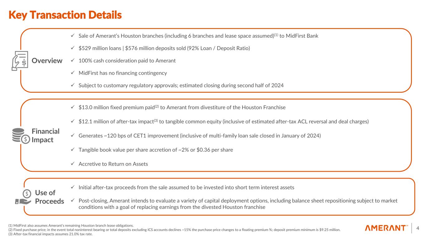 Sale of Amerant’s Houston-based Branch Network & In-Footprint Assets Strengthens the Balance Sheet & Enables Accelerated Focus in Florida 3 Note: Divested balances based on most recently available loan and deposit tapes and management estimates at closing. (1) MidFirst also assumes Amerant’s remaining Houston branch lease obligations. (2) Fixed purchase price; in the event total noninterest bearing or total deposits excluding ICS accounts declines ~15% the purchase price changes to a floating premium %; deposit premium minimum is $9.25 million. (3) Acquired $576 million in deposits less $292 million CD’s. (4) Financial data as of 12/31/2023. (5) Bank-level regulatory capital used. Strategic rationale for the Houston divestiture: Post-closing of transaction, enables Amerant to pursue several accretive strategies including, but not limited to, further organic growth, opportunistic M&A in Florida and share buybacks Capitalizes on strong deposit premium multiples and positions the Texas franchise for continued growth with a well-regarded partner, MidFirst Bank ✓ Size | ~37 billion of assets(4) ✓ Capital | ~18% Common Equity Tier 1(4)(5) ✓ Experience | 6 completed acquisitions since 2009 Improves Amerant’s relative capital position, balance sheet liquidity, and reduces CRE concentration Creates financial and operational flexibility to materially accelerate Amerant’s Florida expansion strategy Following the sale of $401 million in Houston-based multi-family loans in January of 2024, Amerant is selling its Houston-based franchise to MidFirst Bank $529M Total Loans Divested $576M Total Deposits Divested 92% Loan / Deposit ratio on Divested Franchise 6 Branches(1) $13.0M Net Deposit Premium (2) 4.6% Core Deposit Premium(3) ~120 bps CET1 Enhancement ~2% | +$0.36 TBV per share accretion H2 2024 Anticipated Closing 220% Pro Forma Regulatory CRE Concentration Ratio