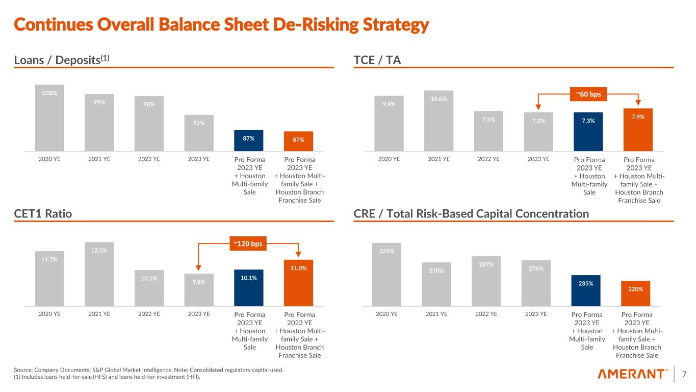 Houston Franchise Loans & Deposit Divestiture 6 Source: S&P Global Market Intelligence; Company Documents. Note: Loan yield data as pf 4/14/2024. Deposit cost of fund data as of 4/16/2024. Note: “OO CRE” defined as Owner Occupied Commercial Real Estate Loans. “NOO CRE” defined as Non-Owner Occupied Commercial Real Estate Loans. Note: Major exchange-traded banks and thrifts with total assets between $7.5 to $12.5 billion, excluding merger targets and mutuals. (1) Reflects the standalone Houston Franchise. (2) Includes loans held-for-investment (HFI). Excludes loans held-for-sale (HFS). Excludes the January 2024 $401 million of Multi-family Loans Non-Interest Checking $79 14% Int Checking, Savings & MM $204 35% Time Deposits (CDs) $292 51% $576M Total Deposits Dollars in millions Cost of Total Deposits: 4.04% Deposit Composition Yield on Loans: 6.57% Loan Composition $529M Total Loans 0 Regulatory CRE Concentration Balance of $132 million ACL / Loans: 0.79(1)% Loan Reserve Coverage 1.39% 1.44% 1.19% Standalone 2023YE Pro Forma $7.5B - $12.5 Bn Banks Pro Forma 2023 YE + Houston Multi-family Sale + Houston Branch Franchise Sale(2) 12/31/23 Actual(2) $7.5 Bn - $12.5 Bn Banks(2) +5 bps 1-4 Family $91 17% OO CRE & C&I $223 42% NOO CRE $112 21% Multi-family $1 0% Construction & Land $19 4% Consumer & Other $83 16%
