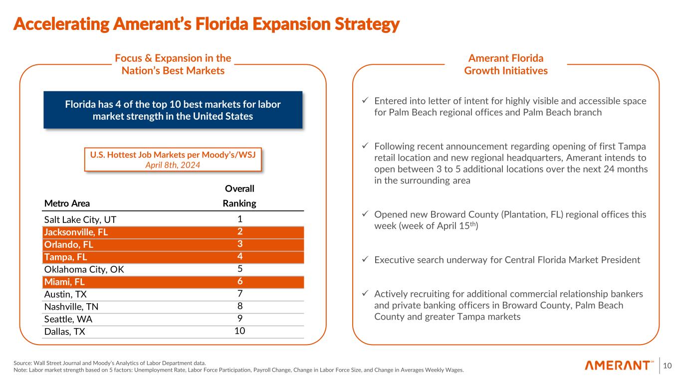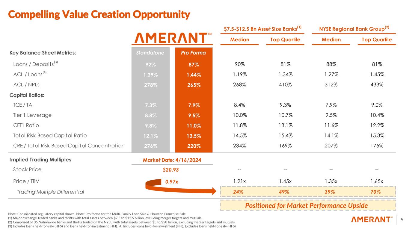 Important Notices and Disclaimers 2 Forward-Looking Statements This presentation contains “forward-looking statements” including statements with respect to the Amerant Bancorp Inc.’s (the “Company’s”) objectives, expectations and intentions and other statements that are not historical facts. All statements other than statements of historical fact are statements that could be forward-looking statements. Forward-looking statements include the Company’s strategic rationale for, and proposed benefits of, the Company’s sale of its Houston franchise (the “Sale Transaction”), the Company’s ability to consummate the Sale Transaction on terms acceptable to the Company, if at all, the Company’s expected use of proceeds from the Sale Transaction, the Company’s business strategy following the consummation of the Sale Transaction, and the Company’s growth initiatives in Florida, including expectations regarding the labor market in Florida. You can identify these forward-looking statements through our use of words such as “may,” “will,” “anticipate,” “assume,” “should,” “indicate,” “would,” “believe,” “contemplate,” “expect,” “estimate,” “continue,” “plan,” “point to,” “project,” “could,” “intend,” “target,” “goals,” “outlooks,” “modeled,” “dedicated,” “create,” and other similar words and expressions of the future. Forward-looking statements, including those relating to our beliefs, plans, objectives, goals, expectations, anticipations, estimates and intentions, involve risks, uncertainties and other factors, which may be beyond our control, and which may cause the Company’s actual results, performance, achievements, or financial condition to be materially different from future results, performance, achievements, or financial condition expressed or implied by such forward-looking statements. You should not rely on any forward-looking statements as predictions of future events. You should not expect us to update any forward-looking statements, except as required by law. All written or oral forward-looking statements attributable to us are expressly qualified in their entirety by this cautionary notice, together with those risks and uncertainties described in “Risk factors” in our annual report on Form 10-K for the fiscal year ended December 31, 2023 filed on March 7, 2024 (the "Form 10-K"), our quarterly report on Form 10-Q, and in our other filings with the U.S. Securities and Exchange Commission (the “SEC”), which are available at the SEC’s website www.sec.gov. Non-GAAP Financial Measures The Company supplements its financial results that are determined in accordance with accounting principles generally accepted in the United States of America (“GAAP”) with non-GAAP financial measures, such as tangible common equity ("TCE"), tangible assets (“TA”) and tangible book value per share ("TBVPS"). This supplemental information is not required by or is not presented in accordance with GAAP. The Company refers to these financial measures and ratios as “non-GAAP financial measures” and they should not be considered in isolation or as a substitute for the GAAP measures presented herein. We use certain non-GAAP financial measures, including those mentioned above, both to explain our results to shareholders and the investment community and in the internal evaluation and management of our businesses. Our management believes that these non-GAAP financial measures and the information they provide are useful to investors since these measures permit investors to view our performance using the same tools that our management uses to evaluate our past performance and prospects for future performance. While we believe that these non-GAAP financial measures are useful in evaluating our performance, this information should be considered as supplemental and not as a substitute for or superior to the related financial information prepared in accordance with GAAP. Additionally, these non-GAAP financial measures may differ from similar measures presented by other companies. Page 13 in the appendix reconciles these non-GAAP financial measures to reported GAAP results.