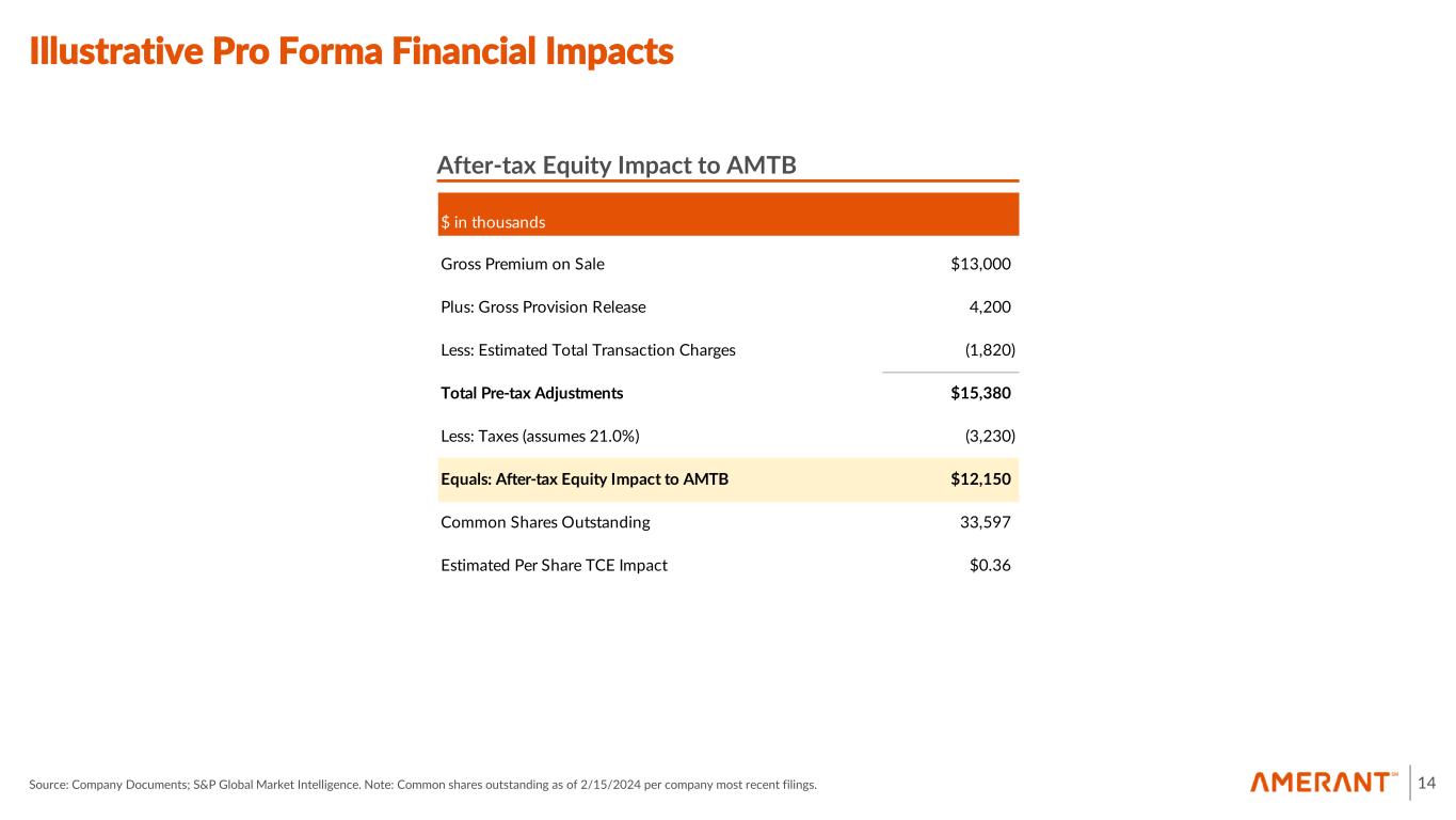 Illustrative Pro Forma Financial Impacts Source: Company Documents; S&P Global Market Intelligence. Note: Common shares outstanding as of 2/15/2024 per company most recent filings. 14 After-tax Equity Impact to AMTB $ in thousands Gross Premium on Sale $13,000 Plus: Gross Provision Release 4,200 Less: Estimated Total Transaction Charges (1,820) Total Pre-tax Adjustments $15,380 Less: Taxes (assumes 21.0%) (3,230) Equals: After-tax Equity Impact to AMTB $12,150 Common Shares Outstanding 33,597 Estimated Per Share TCE Impact $0.36