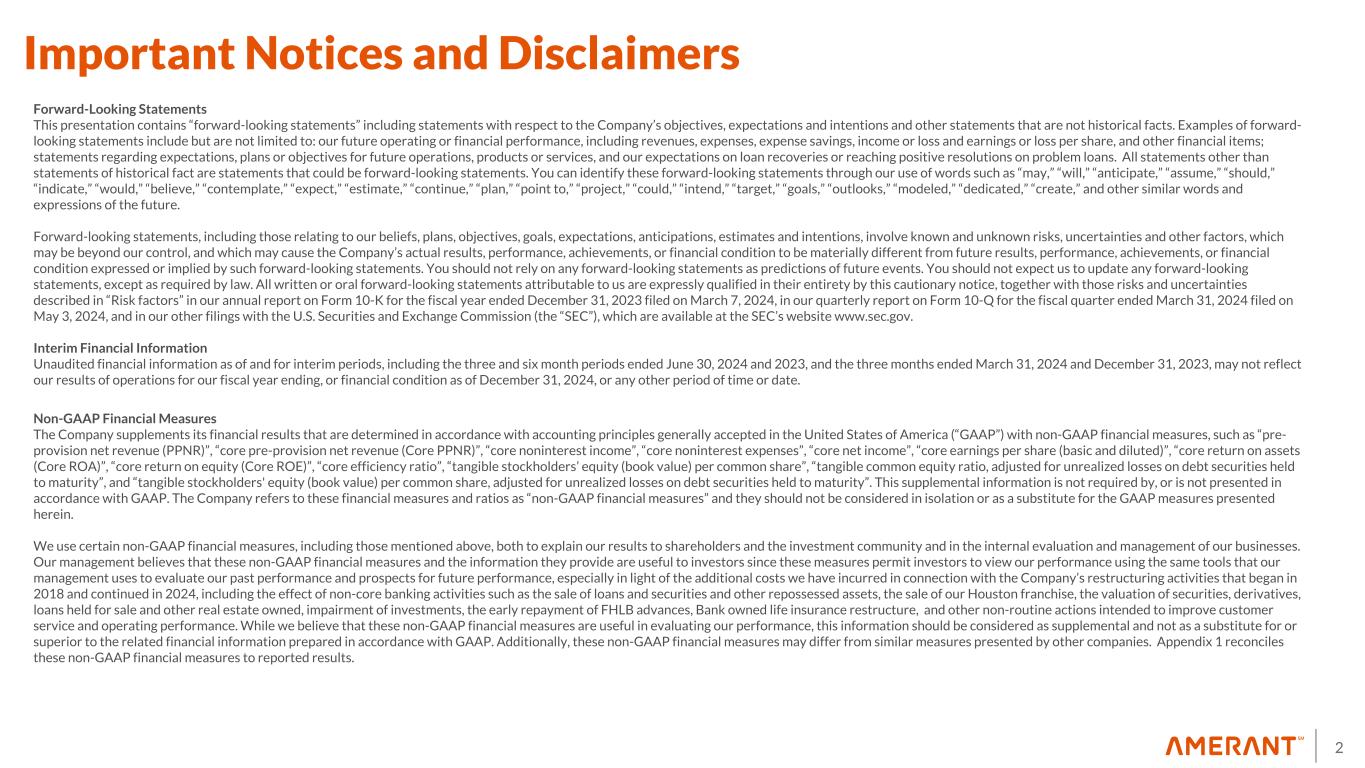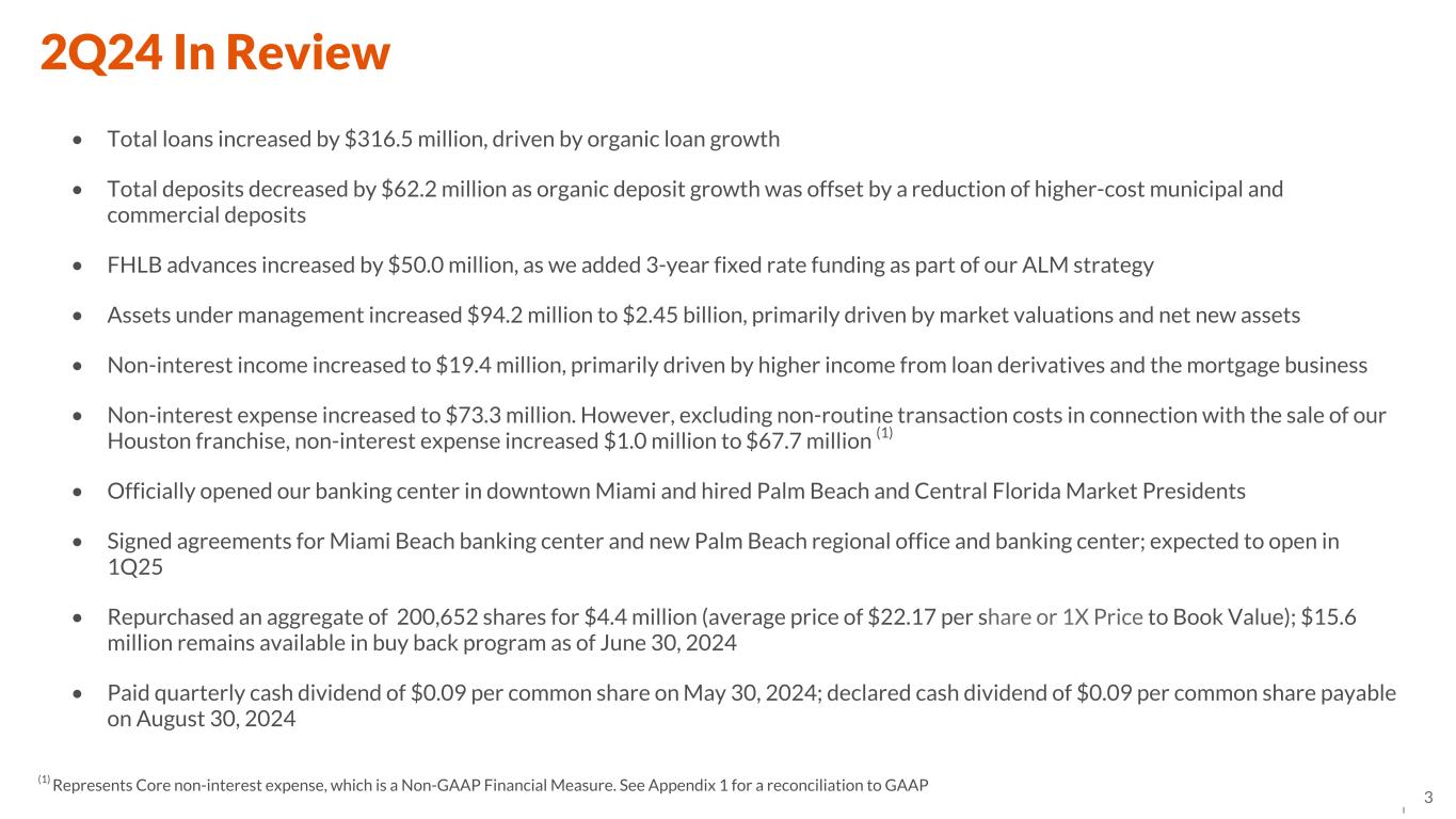 2 Important Notices and Disclaimers Forward-Looking Statements This presentation contains “forward-looking statements” including statements with respect to the Company’s objectives, expectations and intentions and other statements that are not historical facts. Examples of forward- looking statements include but are not limited to: our future operating or financial performance, including revenues, expenses, expense savings, income or loss and earnings or loss per share, and other financial items; statements regarding expectations, plans or objectives for future operations, products or services, and our expectations on loan recoveries or reaching positive resolutions on problem loans. All statements other than statements of historical fact are statements that could be forward-looking statements. You can identify these forward-looking statements through our use of words such as “may,” “will,” “anticipate,” “assume,” “should,” “indicate,” “would,” “believe,” “contemplate,” “expect,” “estimate,” “continue,” “plan,” “point to,” “project,” “could,” “intend,” “target,” “goals,” “outlooks,” “modeled,” “dedicated,” “create,” and other similar words and expressions of the future. Forward-looking statements, including those relating to our beliefs, plans, objectives, goals, expectations, anticipations, estimates and intentions, involve known and unknown risks, uncertainties and other factors, which may be beyond our control, and which may cause the Company’s actual results, performance, achievements, or financial condition to be materially different from future results, performance, achievements, or financial condition expressed or implied by such forward-looking statements. You should not rely on any forward-looking statements as predictions of future events. You should not expect us to update any forward-looking statements, except as required by law. All written or oral forward-looking statements attributable to us are expressly qualified in their entirety by this cautionary notice, together with those risks and uncertainties described in “Risk factors” in our annual report on Form 10-K for the fiscal year ended December 31, 2023 filed on March 7, 2024, in our quarterly report on Form 10-Q for the fiscal quarter ended March 31, 2024 filed on May 3, 2024, and in our other filings with the U.S. Securities and Exchange Commission (the “SEC”), which are available at the SEC’s website www.sec.gov. Interim Financial Information Unaudited financial information as of and for interim periods, including the three and six month periods ended June 30, 2024 and 2023, and the three months ended March 31, 2024 and December 31, 2023, may not reflect our results of operations for our fiscal year ending, or financial condition as of December 31, 2024, or any other period of time or date. Non-GAAP Financial Measures The Company supplements its financial results that are determined in accordance with accounting principles generally accepted in the United States of America (“GAAP”) with non-GAAP financial measures, such as “pre- provision net revenue (PPNR)”, “core pre-provision net revenue (Core PPNR)”, “core noninterest income”, “core noninterest expenses”, “core net income”, “core earnings per share (basic and diluted)”, “core return on assets (Core ROA)”, “core return on equity (Core ROE)”, “core efficiency ratio”, “tangible stockholders’ equity (book value) per common share”, “tangible common equity ratio, adjusted for unrealized losses on debt securities held to maturity”, and “tangible stockholders' equity (book value) per common share, adjusted for unrealized losses on debt securities held to maturity”. This supplemental information is not required by, or is not presented in accordance with GAAP. The Company refers to these financial measures and ratios as “non-GAAP financial measures” and they should not be considered in isolation or as a substitute for the GAAP measures presented herein. We use certain non-GAAP financial measures, including those mentioned above, both to explain our results to shareholders and the investment community and in the internal evaluation and management of our businesses. Our management believes that these non-GAAP financial measures and the information they provide are useful to investors since these measures permit investors to view our performance using the same tools that our management uses to evaluate our past performance and prospects for future performance, especially in light of the additional costs we have incurred in connection with the Company’s restructuring activities that began in 2018 and continued in 2024, including the effect of non-core banking activities such as the sale of loans and securities and other repossessed assets, the sale of our Houston franchise, the valuation of securities, derivatives, loans held for sale and other real estate owned, impairment of investments, the early repayment of FHLB advances, Bank owned life insurance restructure, and other non-routine actions intended to improve customer service and operating performance. While we believe that these non-GAAP financial measures are useful in evaluating our performance, this information should be considered as supplemental and not as a substitute for or superior to the related financial information prepared in accordance with GAAP. Additionally, these non-GAAP financial measures may differ from similar measures presented by other companies. Appendix 1 reconciles these non-GAAP financial measures to reported results.