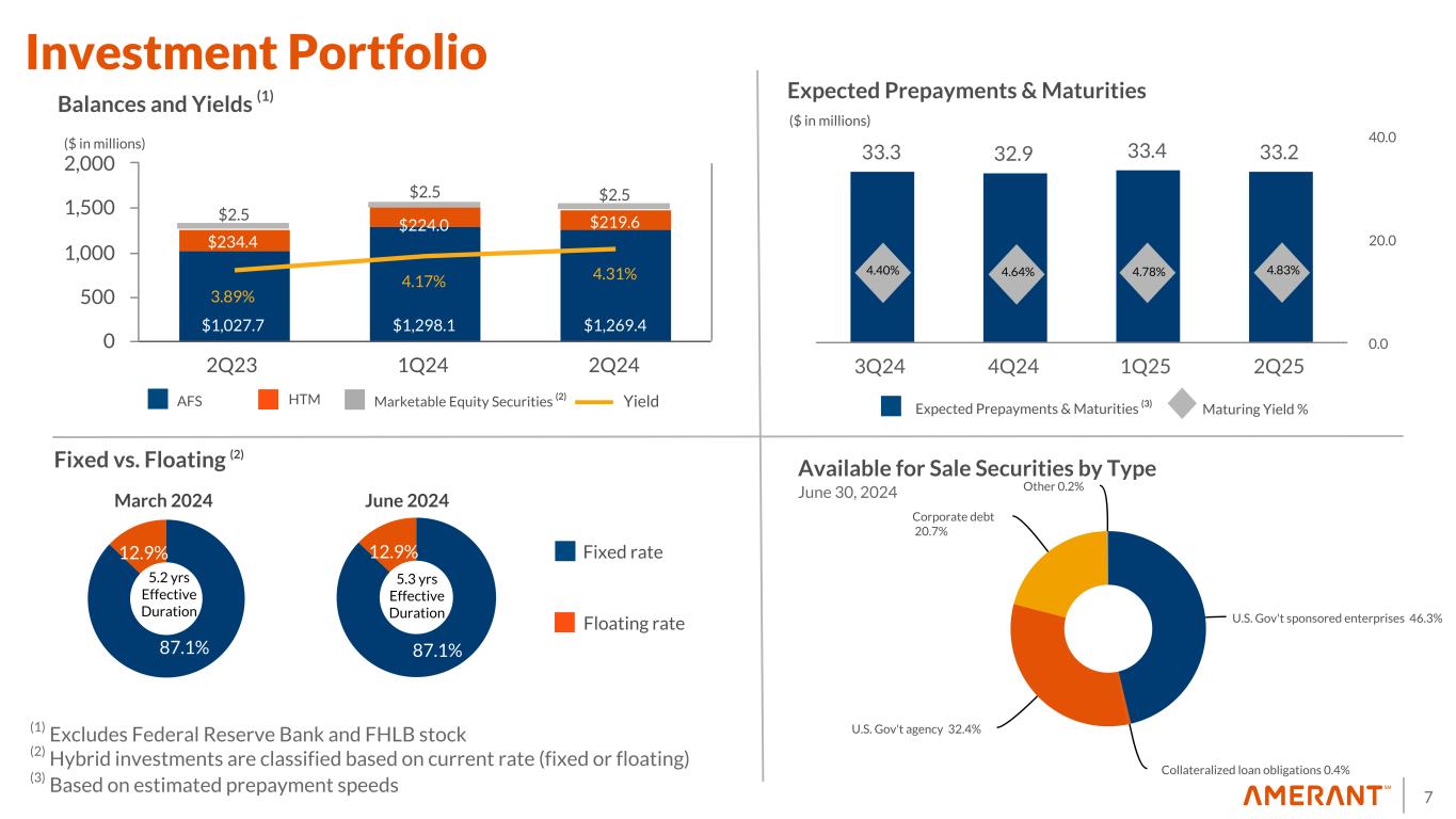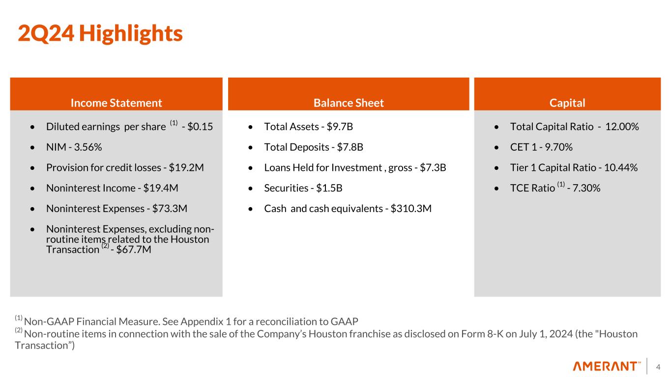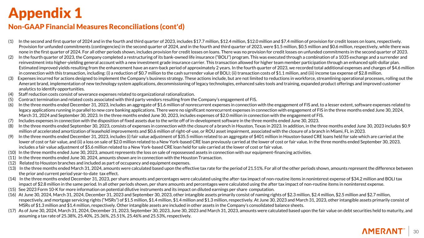 30 Appendix 1 Non-GAAP Financial Measures Reconciliations (cont'd) (1) In the second and first quarter of 2024 and in the fourth and third quarter of 2023, includes $17.7 million, $12.4 million, $12.0 million and $7.4 million of provision for credit losses on loans, respectively. Provision for unfunded commitments (contingencies) in the second quarter of 2024, and in the fourth and third quarter of 2023, were $1.5 million, $0.5 million and $0.6 million, respectively, while there was none in the first quarter of 2024. For all other periods shown, includes provision for credit losses on loans. There was no provision for credit losses on unfunded commitments in the second quarter of 2023. (2) In the fourth quarter of 2023, the Company completed a restructuring of its bank-owned life insurance (“BOLI”) program. This was executed through a combination of a 1035 exchange and a surrender and reinvestment into higher-yielding general account with a new investment grade insurance carrier. This transaction allowed for higher team member participation through an enhanced split-dollar plan. Estimated improved yields resulting from the enhancement have an earn-back period of approximately 2 years. In the fourth quarter of 2023, we recorded total additional expenses and charges of $4.6 million in connection with this transaction, including: (i) a reduction of $0.7 million to the cash surrender value of BOLI; (ii) transaction costs of $1.1 million, and (iii) income tax expense of $2.8 million. (3) Expenses incurred for actions designed to implement the Company’s business strategy. These actions include, but are not limited to reductions in workforce, streamlining operational processes, rolling out the Amerant brand, implementation of new technology system applications, decommissioning of legacy technologies, enhanced sales tools and training, expanded product offerings and improved customer analytics to identify opportunities. (4) Staff reduction costs consist of severance expenses related to organizational rationalization. (5) Contract termination and related costs associated with third party vendors resulting from the Company’s engagement of FIS. (6) In the three months ended December 31, 2023, includes an aggregate of $1.6 million of nonrecurrent expenses in connection with the engagement of FIS and, to a lesser extent, software expenses related to legacy applications running in parallel to new core banking applications. There were no significant nonrecurrent expenses in connection with engagement of FIS in the three months ended June 30, 2024, March 31, 2024 and September 30, 2023. In the three months ended June 30, 2023, includes expenses of $2.0 million in connection with the engagement of FIS. (7) Includes expenses in connection with the disposition of fixed assets due to the write off of in-development software in the three months ended June 30, 2023. (8) In the three months ended September 30, 2023, consists of expenses in connection with the closure of a branch in Houston, Texas in 2023. In addition, in the three months ended June 30, 2023 includes $0.9 million of accelerated amortization of leasehold improvements and $0.6 million of right-of-use, or ROU asset impairment, associated with the closure of a branch in Miami, FL in 2023. (9) In the three months ended December 31, 2023, includes (i) fair value adjustment of $35.5 million related to an aggregate of $401 million in Houston-based CRE loans held for sale which are carried at the lower of cost or fair value, and (ii) a loss on sale of $2.0 million related to a New York-based CRE loan previously carried at the lower of cost or fair value. In the three months ended September 30, 2023, includes a fair value adjustment of $5.6 million related to a New York-based CRE loan held for sale carried at the lower of cost or fair value. (10) In the three months ended June 30, 2023, amount represents the loss on sale of repossessed assets in connection with our equipment-financing activities. (11) In the three months ended June 30, 2024, amounts shown are in connection with the Houston Transaction. (12) Related to Houston branches and included as part of occupancy and equipment expenses. (13) In the three months ended March 31, 2024, amounts were calculated based upon the effective tax rate for the period of 21.51%. For all of the other periods shown, amounts represent the difference between the prior and current period year-to-date tax effect. (14) In the three months ended December 31, 2023, per share amounts and percentages were calculated using the after-tax impact of non-routine items in noninterest expense of $34.2 million and BOLI tax impact of $2.8 million in the same period. In all other periods shown, per share amounts and percentages were calculated using the after tax impact of non-routine items in noninterest expense. (15) See 2023 Form 10-K for more information on potential dilutive instruments and its impact on diluted earnings per share computation. (16) At June 30, 2024, March 31, 2024, December 31, 2023 and September 30, 2023, other intangible assets primarily consist of naming rights of $2.3 million, $2.4 million, $2.5 million and $2.7 million, respectively, and mortgage servicing rights (“MSRs”) of $1.5 million, $1.4 million, $1.4 million and $1.3 million, respectively. At June 30, 2023 and March 31, 2023, other intangible assets primarily consist of MSRs of $1.3 million and $1.4 million, respectively. Other intangible assets are included in other assets in the Company’s consolidated balance sheets. (17) As of June 30, 2024, March 31, 2024, December 31, 2023, September 30, 2023, June 30, 2023 and March 31, 2023, amounts were calculated based upon the fair value on debt securities held to maturity, and assuming a tax rate of 25.38%, 25.40%, 25.36%, 25.51%, 25.46% and 25.53%, respectively.