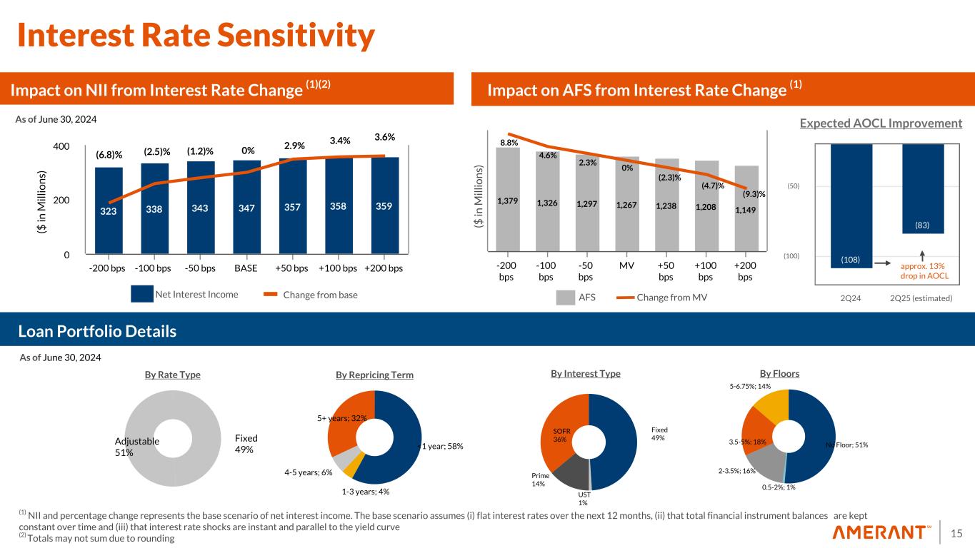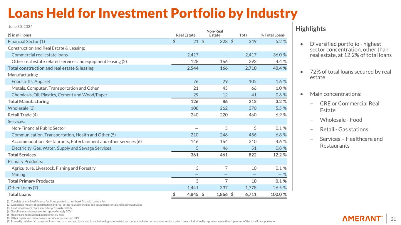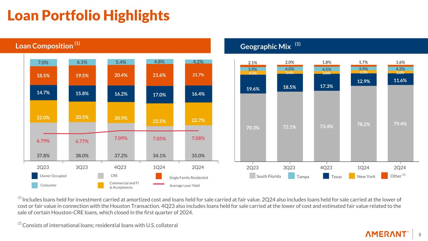30 Appendix 1 Non-GAAP Financial Measures Reconciliations (cont'd) (1) In the second and first quarter of 2024 and in the fourth and third quarter of 2023, includes $17.7 million, $12.4 million, $12.0 million and $7.4 million of provision for credit losses on loans, respectively. Provision for unfunded commitments (contingencies) in the second quarter of 2024, and in the fourth and third quarter of 2023, were $1.5 million, $0.5 million and $0.6 million, respectively, while there was none in the first quarter of 2024. For all other periods shown, includes provision for credit losses on loans. There was no provision for credit losses on unfunded commitments in the second quarter of 2023. (2) In the fourth quarter of 2023, the Company completed a restructuring of its bank-owned life insurance (“BOLI”) program. This was executed through a combination of a 1035 exchange and a surrender and reinvestment into higher-yielding general account with a new investment grade insurance carrier. This transaction allowed for higher team member participation through an enhanced split-dollar plan. Estimated improved yields resulting from the enhancement have an earn-back period of approximately 2 years. In the fourth quarter of 2023, we recorded total additional expenses and charges of $4.6 million in connection with this transaction, including: (i) a reduction of $0.7 million to the cash surrender value of BOLI; (ii) transaction costs of $1.1 million, and (iii) income tax expense of $2.8 million. (3) Expenses incurred for actions designed to implement the Company’s business strategy. These actions include, but are not limited to reductions in workforce, streamlining operational processes, rolling out the Amerant brand, implementation of new technology system applications, decommissioning of legacy technologies, enhanced sales tools and training, expanded product offerings and improved customer analytics to identify opportunities. (4) Staff reduction costs consist of severance expenses related to organizational rationalization. (5) Contract termination and related costs associated with third party vendors resulting from the Company’s engagement of FIS. (6) In the three months ended December 31, 2023, includes an aggregate of $1.6 million of nonrecurrent expenses in connection with the engagement of FIS and, to a lesser extent, software expenses related to legacy applications running in parallel to new core banking applications. There were no significant nonrecurrent expenses in connection with engagement of FIS in the three months ended June 30, 2024, March 31, 2024 and September 30, 2023. In the three months ended June 30, 2023, includes expenses of $2.0 million in connection with the engagement of FIS. (7) Includes expenses in connection with the disposition of fixed assets due to the write off of in-development software in the three months ended June 30, 2023. (8) In the three months ended September 30, 2023, consists of expenses in connection with the closure of a branch in Houston, Texas in 2023. In addition, in the three months ended June 30, 2023 includes $0.9 million of accelerated amortization of leasehold improvements and $0.6 million of right-of-use, or ROU asset impairment, associated with the closure of a branch in Miami, FL in 2023. (9) In the three months ended December 31, 2023, includes (i) fair value adjustment of $35.5 million related to an aggregate of $401 million in Houston-based CRE loans held for sale which are carried at the lower of cost or fair value, and (ii) a loss on sale of $2.0 million related to a New York-based CRE loan previously carried at the lower of cost or fair value. In the three months ended September 30, 2023, includes a fair value adjustment of $5.6 million related to a New York-based CRE loan held for sale carried at the lower of cost or fair value. (10) In the three months ended June 30, 2023, amount represents the loss on sale of repossessed assets in connection with our equipment-financing activities. (11) In the three months ended June 30, 2024, amounts shown are in connection with the Houston Transaction. (12) Related to Houston branches and included as part of occupancy and equipment expenses. (13) In the three months ended March 31, 2024, amounts were calculated based upon the effective tax rate for the period of 21.51%. For all of the other periods shown, amounts represent the difference between the prior and current period year-to-date tax effect. (14) In the three months ended December 31, 2023, per share amounts and percentages were calculated using the after-tax impact of non-routine items in noninterest expense of $34.2 million and BOLI tax impact of $2.8 million in the same period. In all other periods shown, per share amounts and percentages were calculated using the after tax impact of non-routine items in noninterest expense. (15) See 2023 Form 10-K for more information on potential dilutive instruments and its impact on diluted earnings per share computation. (16) At June 30, 2024, March 31, 2024, December 31, 2023 and September 30, 2023, other intangible assets primarily consist of naming rights of $2.3 million, $2.4 million, $2.5 million and $2.7 million, respectively, and mortgage servicing rights (“MSRs”) of $1.5 million, $1.4 million, $1.4 million and $1.3 million, respectively. At June 30, 2023 and March 31, 2023, other intangible assets primarily consist of MSRs of $1.3 million and $1.4 million, respectively. Other intangible assets are included in other assets in the Company’s consolidated balance sheets. (17) As of June 30, 2024, March 31, 2024, December 31, 2023, September 30, 2023, June 30, 2023 and March 31, 2023, amounts were calculated based upon the fair value on debt securities held to maturity, and assuming a tax rate of 25.38%, 25.40%, 25.36%, 25.51%, 25.46% and 25.53%, respectively.