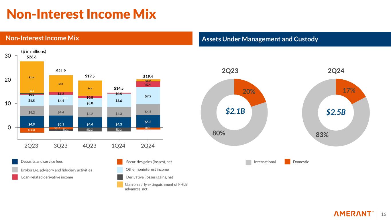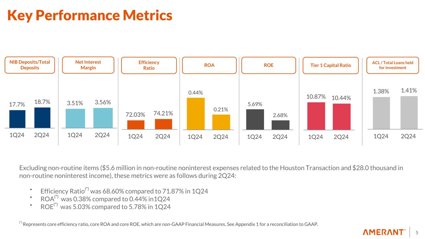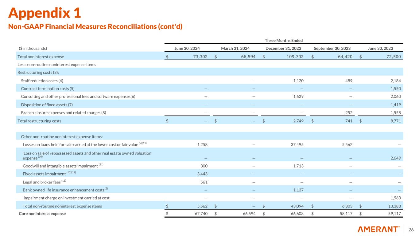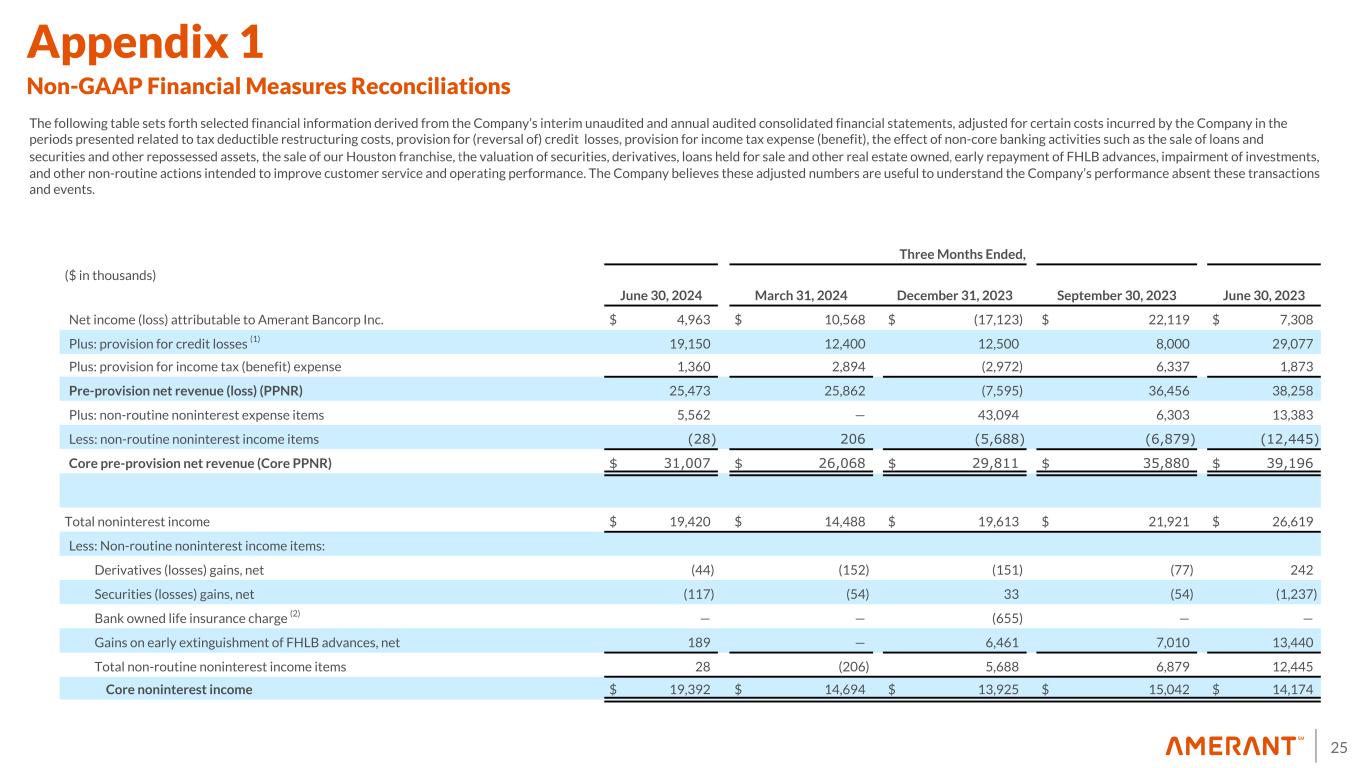 25 Appendix 1 Non-GAAP Financial Measures Reconciliations The following table sets forth selected financial information derived from the Company’s interim unaudited and annual audited consolidated financial statements, adjusted for certain costs incurred by the Company in the periods presented related to tax deductible restructuring costs, provision for (reversal of) credit losses, provision for income tax expense (benefit), the effect of non-core banking activities such as the sale of loans and securities and other repossessed assets, the sale of our Houston franchise, the valuation of securities, derivatives, loans held for sale and other real estate owned, early repayment of FHLB advances, impairment of investments, and other non-routine actions intended to improve customer service and operating performance. The Company believes these adjusted numbers are useful to understand the Company’s performance absent these transactions and events. Three Months Ended, ($ in thousands) June 30, 2024 March 31, 2024 December 31, 2023 September 30, 2023 June 30, 2023 Net income (loss) attributable to Amerant Bancorp Inc. $ 4,963 $ 10,568 $ (17,123) $ 22,119 $ 7,308 Plus: provision for credit losses (1) 19,150 12,400 12,500 8,000 29,077 Plus: provision for income tax (benefit) expense 1,360 2,894 (2,972) 6,337 1,873 Pre-provision net revenue (loss) (PPNR) 25,473 25,862 (7,595) 36,456 38,258 Plus: non-routine noninterest expense items 5,562 — 43,094 6,303 13,383 Less: non-routine noninterest income items (28) 206 (5,688) (6,879) (12,445) Core pre-provision net revenue (Core PPNR) $ 31,007 $ 26,068 $ 29,811 $ 35,880 $ 39,196 Total noninterest income $ 19,420 $ 14,488 $ 19,613 $ 21,921 $ 26,619 Less: Non-routine noninterest income items: Derivatives (losses) gains, net (44) (152) (151) (77) 242 Securities (losses) gains, net (117) (54) 33 (54) (1,237) Bank owned life insurance charge (2) — — (655) — — Gains on early extinguishment of FHLB advances, net 189 — 6,461 7,010 13,440 Total non-routine noninterest income items 28 (206) 5,688 6,879 12,445 Core noninterest income $ 19,392 $ 14,694 $ 13,925 $ 15,042 $ 14,174