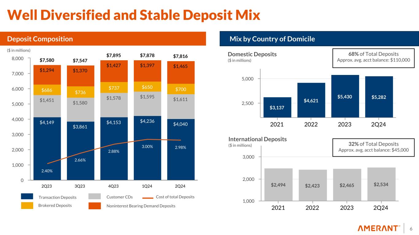 6 $7,580 $7,547 $7,895 $7,878 $7,816 $4,149 $3,861 $4,153 $4,236 $4,040 $1,451 $1,580 $1,578 $1,595 $1,611 $686 $736 $737 $650 $700 $1,294 $1,370 $1,427 $1,397 $1,465 2.40% 2.66% 2.88% 3.00% 2.98% 2Q23 3Q23 4Q23 1Q24 2Q24 0 1,000 2,000 3,000 4,000 5,000 6,000 7,000 8,000 $2,494 $2,423 $2,465 $2,534 2021 2022 2023 2Q24 1,000 2,000 3,000 $3,137 $4,621 $5,430 $5,282 2021 2022 2023 2Q24 2,500 5,000 Domestic Deposits ($ in millions) Deposit Composition International Deposits ($ in millions) Mix by Country of Domicile Transaction Deposits Customer CDs Brokered Deposits Cost of total Deposits ($ in millions) Noninterest Bearing Demand Deposits 32% of Total Deposits Approx. avg. acct balance: $45,000 68% of Total Deposits Approx. avg. acct balance: $110,000 Well Diversified and Stable Deposit Mix