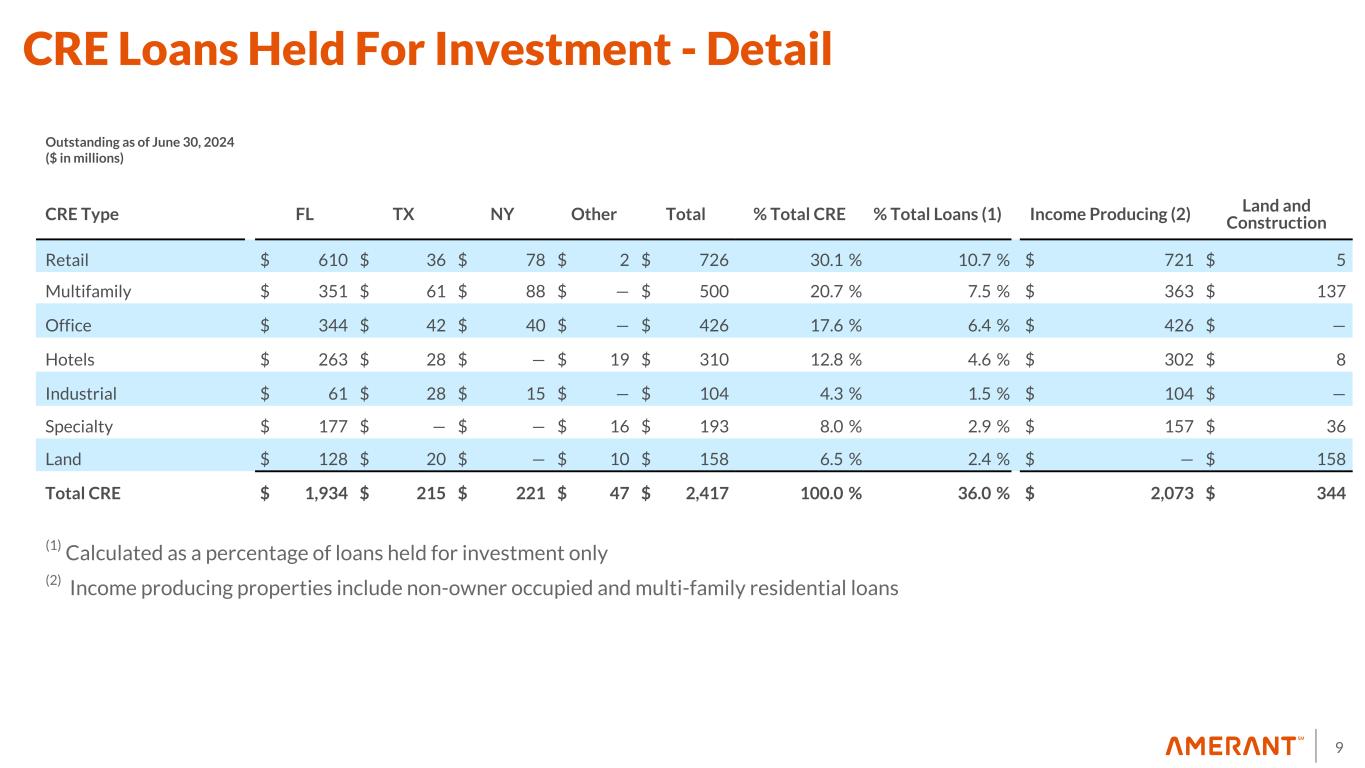 8 37.8% 38.0% 37.2% 34.1% 35.0% 22.0% 20.5% 20.9% 22.5% 22.7% 14.7% 15.8% 16.2% 17.0% 16.4% 18.5% 19.5% 20.4% 21.6% 21.7% 7.0% 6.1% 5.4% 4.8% 4.2% 6.79% 6.77% 7.09% 7.05% 7.08% 2Q23 3Q23 4Q23 1Q24 2Q24 70.3% 72.1% 73.4% 78.2% 79.4% 19.6% 18.5% 17.3% 12.9% 11.6% 4.1% 3.4% 3.0% 3.3% 3.0% 3.9% 4.0% 4.5% 3.9% 4.2% 2.1% 2.0% 1.8% 1.7% 1.6% 2Q23 3Q23 4Q23 1Q24 2Q24 Consumer CRE Commercial and FI & Acceptances Owner Occupied Single Family Residential Loan Composition (1) Geographic Mix (Domestic) Geographic ix (1) South Florida Texas New York Average Loan Yield Other (2) (1) Includes loans held for investment carried at amortized cost and loans held for sale carried at fair value. 2Q24 also includes loans held for sale carried at the lower of cost or fair value in connection with the Houston Transaction. 4Q23 also includes loans held for sale carried at the lower of cost and estimated fair value related to the sale of certain Houston-CRE loans, which closed in the first quarter of 2024. (2) Consists of international loans; residential loans with U.S. collateral Tampa Loan Portfolio Highlights