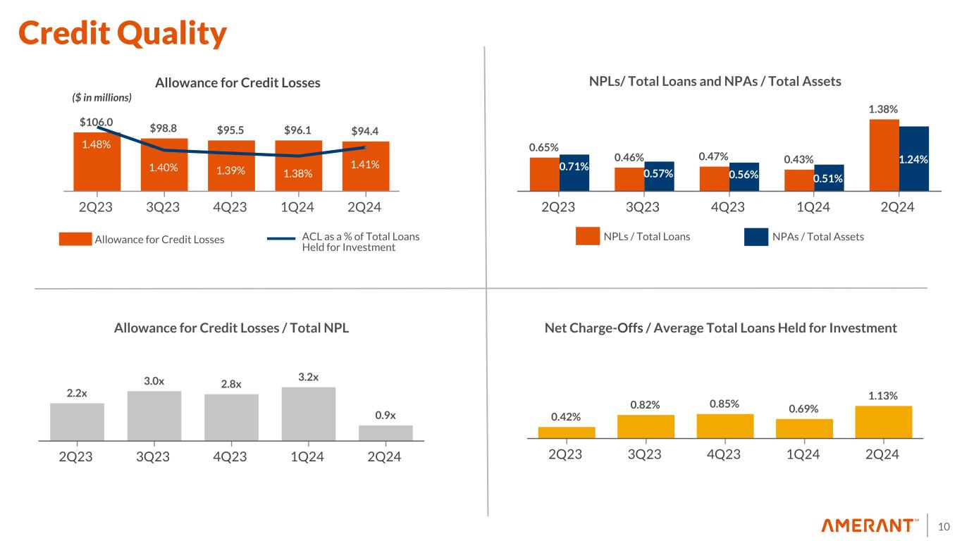 9 CRE Type FL TX NY Other Total % Total CRE % Total Loans (1) Income Producing (2) Land and Construction Retail $ 610 $ 36 $ 78 $ 2 $ 726 30.1 % 10.7 % $ 721 $ 5 Multifamily $ 351 $ 61 $ 88 $ — $ 500 20.7 % 7.5 % $ 363 $ 137 Office $ 344 $ 42 $ 40 $ — $ 426 17.6 % 6.4 % $ 426 $ — Hotels $ 263 $ 28 $ — $ 19 $ 310 12.8 % 4.6 % $ 302 $ 8 Industrial $ 61 $ 28 $ 15 $ — $ 104 4.3 % 1.5 % $ 104 $ — Specialty $ 177 $ — $ — $ 16 $ 193 8.0 % 2.9 % $ 157 $ 36 Land $ 128 $ 20 $ — $ 10 $ 158 6.5 % 2.4 % $ — $ 158 Total CRE $ 1,934 $ 215 $ 221 $ 47 $ 2,417 100.0 % 36.0 % $ 2,073 $ 344 Outstanding as of June 30, 2024 ($ in millions) (1) Calculated as a percentage of loans held for investment only (2) Income producing properties include non-owner occupied and multi-family residential loans CRE Loans Held For Investment - Detail