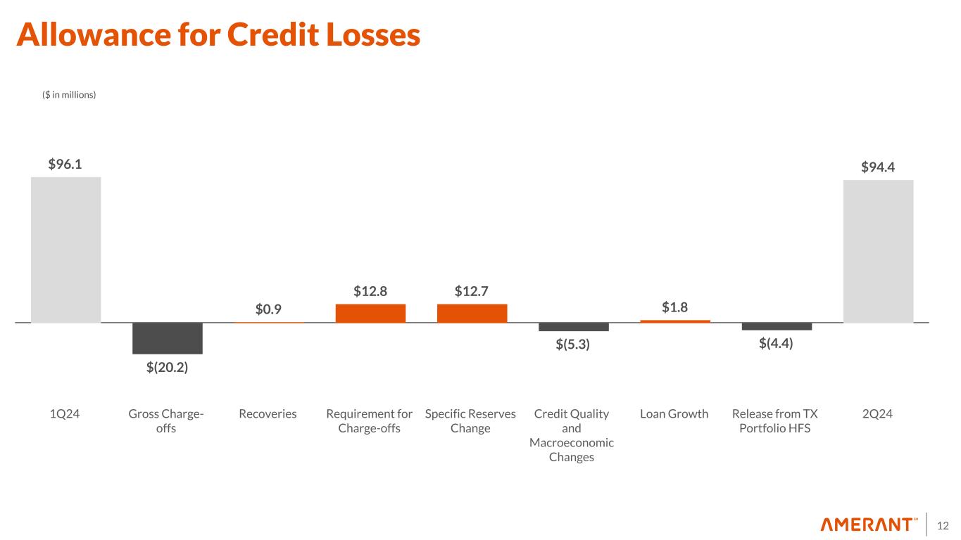12 $96.1 $(20.2) $0.9 $12.8 $12.7 $(5.3) $1.8 $(4.4) $94.4 1Q24 Gross Charge- offs Recoveries Requirement for Charge-offs Specific Reserves Change Credit Quality and Macroeconomic Changes Loan Growth Release from TX Portfolio HFS 2Q24 ($ in millions) Allowance for Credit Losses