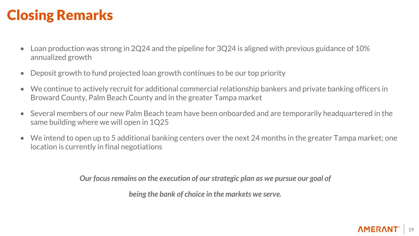 19 Closing Remarks • Loan production was strong in 2Q24 and the pipeline for 3Q24 is aligned with previous guidance of 10% annualized growth • Deposit growth to fund projected loan growth continues to be our top priority • We continue to actively recruit for additional commercial relationship bankers and private banking officers in Broward County, Palm Beach County and in the greater Tampa market • Several members of our new Palm Beach team have been onboarded and are temporarily headquartered in the same building where we will open in 1Q25 • We intend to open up to 5 additional banking centers over the next 24 months in the greater Tampa market; one location is currently in final negotiations Our focus remains on the execution of our strategic plan as we pursue our goal of being the bank of choice in the markets we serve.