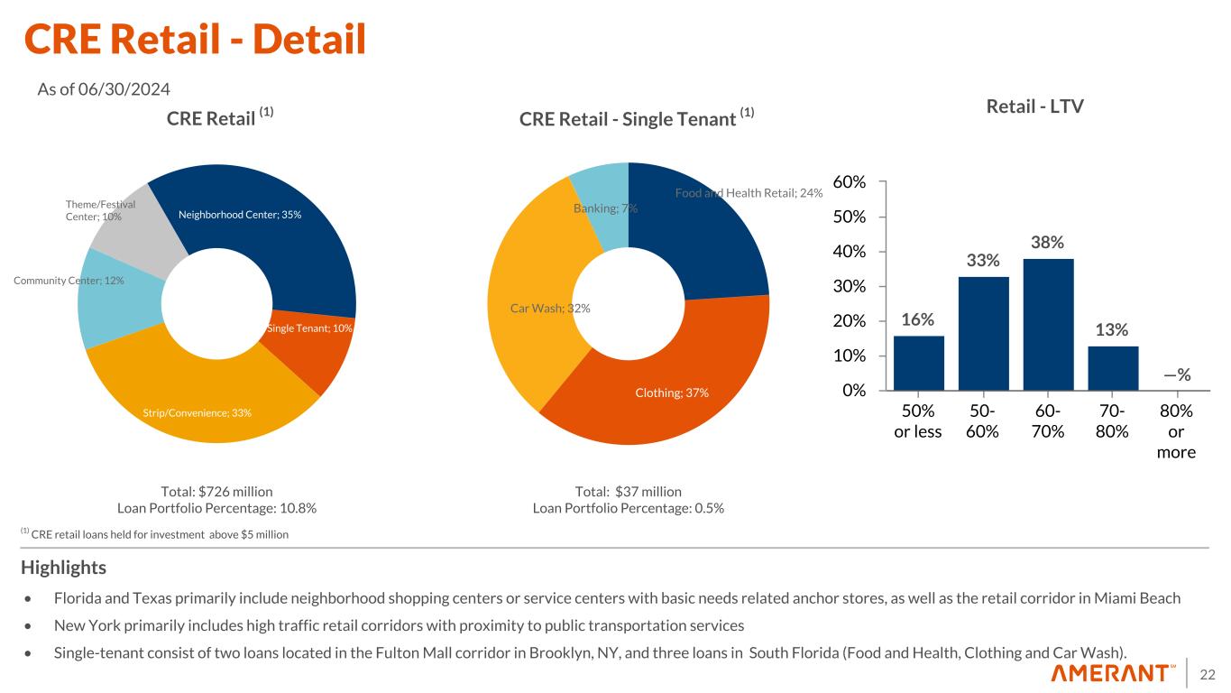 22 16% 33% 38% 13% —% 50% or less 50- 60% 60- 70% 70- 80% 80% or more 0% 10% 20% 30% 40% 50% 60% • Florida and Texas primarily include neighborhood shopping centers or service centers with basic needs related anchor stores, as well as the retail corridor in Miami Beach • New York primarily includes high traffic retail corridors with proximity to public transportation services • Single-tenant consist of two loans located in the Fulton Mall corridor in Brooklyn, NY, and three loans in South Florida (Food and Health, Clothing and Car Wash). Highlights CRE Retail (1) Retail - LTV Food and Health Retail; 24% Clothing; 37% Car Wash; 32% Banking; 7% CRE Retail - Single Tenant (1) (1) CRE retail loans held for investment above $5 million Total: $726 million Loan Portfolio Percentage: 10.8% Total: $37 million Loan Portfolio Percentage: 0.5% Neighborhood Center; 35% Single Tenant; 10% Strip/Convenience; 33% Community Center; 12% Theme/Festival Center; 10% CRE Retail - Detail As of 06/30/2024