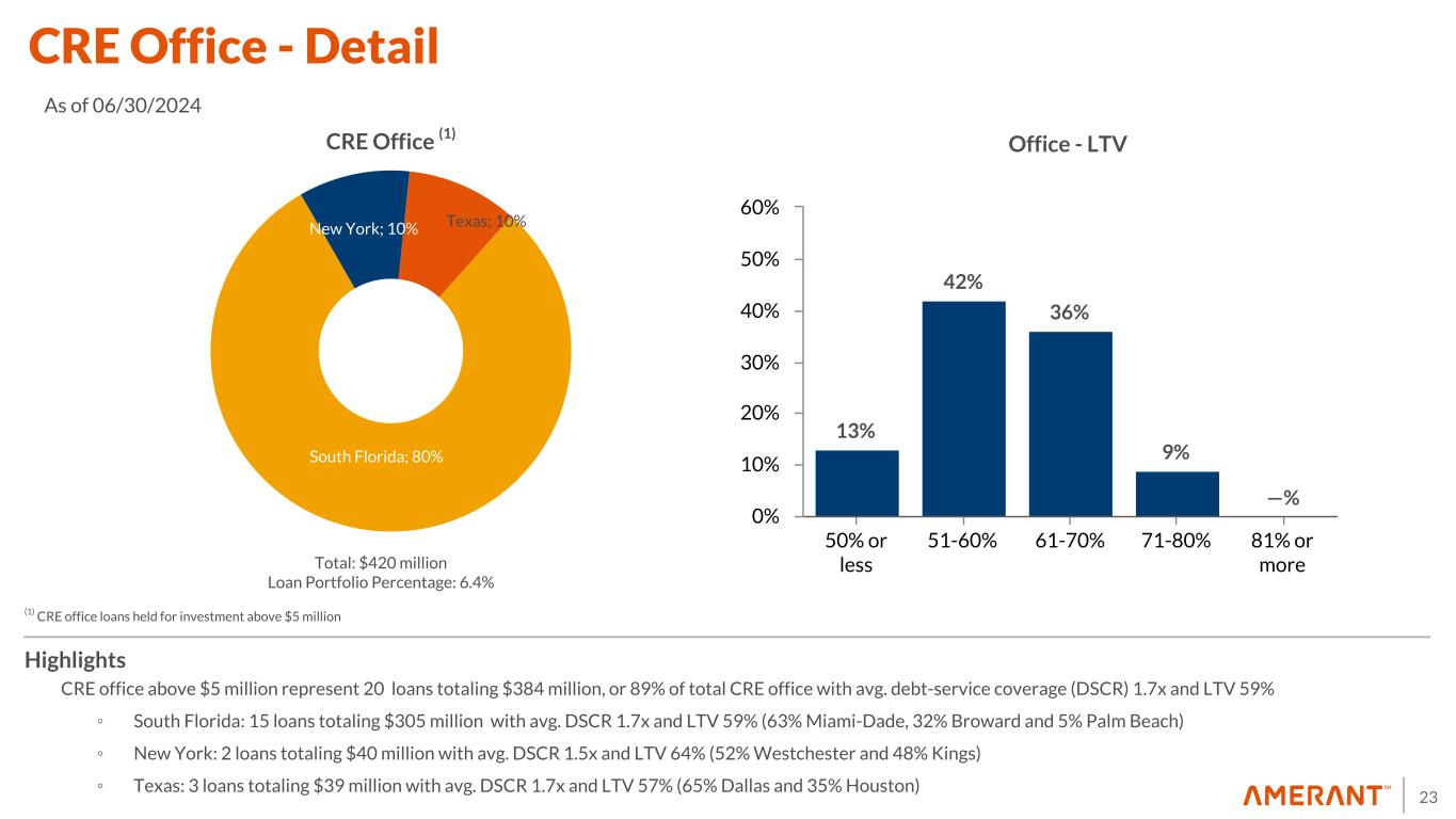 23 New York; 10% Texas; 10% South Florida; 80% 13% 42% 36% 9% —% 50% or less 51-60% 61-70% 71-80% 81% or more 0% 10% 20% 30% 40% 50% 60% CRE office above $5 million represent 20 loans totaling $384 million, or 89% of total CRE office with avg. debt-service coverage (DSCR) 1.7x and LTV 59% ◦ South Florida: 15 loans totaling $305 million with avg. DSCR 1.7x and LTV 59% (63% Miami-Dade, 32% Broward and 5% Palm Beach) ◦ New York: 2 loans totaling $40 million with avg. DSCR 1.5x and LTV 64% (52% Westchester and 48% Kings) ◦ Texas: 3 loans totaling $39 million with avg. DSCR 1.7x and LTV 57% (65% Dallas and 35% Houston) Highlights CRE Office (1) Office - LTV (1) CRE office loans held for investment above $5 million Total: $420 million Loan Portfolio Percentage: 6.4% CRE Office - Detail As of 06/30/2024