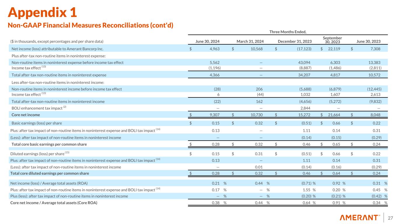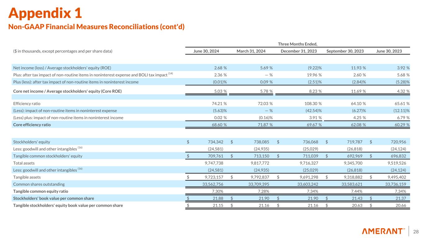 27 Three Months Ended, ($ in thousands, except percentages and per share data) June 30, 2024 March 31, 2024 December 31, 2023 September 30, 2023 June 30, 2023 Net income (loss) attributable to Amerant Bancorp Inc. $ 4,963 $ 10,568 $ (17,123) $ 22,119 $ 7,308 Plus after-tax non-routine items in noninterest expense: Non-routine items in noninterest expense before income tax effect 5,562 — 43,094 6,303 13,383 Income tax effect (13) (1,196) — (8,887) (1,486) (2,811) Total after-tax non-routine items in noninterest expense 4,366 — 34,207 4,817 10,572 Less after-tax non-routine items in noninterest income: Non-routine items in noninterest income before income tax effect (28) 206 (5,688) (6,879) (12,445) Income tax effect (13) 6 (44) 1,032 1,607 2,613 Total after-tax non-routine items in noninterest income (22) 162 (4,656) (5,272) (9,832) BOLI enhancement tax impact (2) — — 2,844 — — Core net income $ 9,307 $ 10,730 $ 15,272 $ 21,664 $ 8,048 Basic earnings (loss) per share $ 0.15 $ 0.32 $ (0.51) $ 0.66 $ 0.22 Plus: after tax impact of non-routine items in noninterest expense and BOLI tax impact (14) 0.13 — 1.11 0.14 0.31 (Less): after tax impact of non-routine items in noninterest income — — (0.14) (0.15) (0.29) Total core basic earnings per common share $ 0.28 $ 0.32 $ 0.46 $ 0.65 $ 0.24 Diluted earnings (loss) per share (15) $ 0.15 $ 0.31 $ (0.51) $ 0.66 $ 0.22 Plus: after tax impact of non-routine items in noninterest expense and BOLI tax impact (14) 0.13 — 1.11 0.14 0.31 (Less): after tax impact of non-routine items in noninterest income — 0.01 (0.14) (0.16) (0.29) Total core diluted earnings per common share $ 0.28 $ 0.32 $ 0.46 $ 0.64 $ 0.24 Net income (loss) / Average total assets (ROA) 0.21 % 0.44 % (0.71) % 0.92 % 0.31 % Plus: after tax impact of non-routine items in noninterest expense and BOLI tax impact (14) 0.17 % — % 1.55 % 0.20 % 0.45 % Plus (less): after tax impact of non-routine items in noninterest income — % — % (0.20) % (0.21) % (0.42) % Core net income / Average total assets (Core ROA) 0.38 % 0.44 % 0.64 % 0.91 % 0.34 % Appendix 1 Non-GAAP Financial Measures Reconciliations (cont'd)