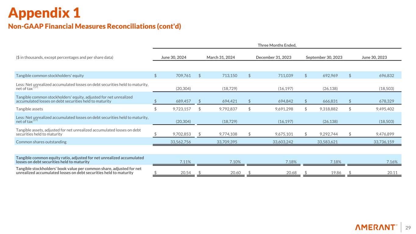 28 Three Months Ended, ($ in thousands, except percentages and per share data) June 30, 2024 March 31, 2024 December 31, 2023 September 30, 2023 June 30, 2023 Net income (loss) / Average stockholders' equity (ROE) 2.68 % 5.69 % (9.22) % 11.93 % 3.92 % Plus: after tax impact of non-routine items in noninterest expense and BOLI tax impact (14) 2.36 % — % 19.96 % 2.60 % 5.68 % Plus (less): after tax impact of non-routine items in noninterest income (0.01) % 0.09 % (2.51) % (2.84) % (5.28) % Core net income / Average stockholders' equity (Core ROE) 5.03 % 5.78 % 8.23 % 11.69 % 4.32 % Efficiency ratio 74.21 % 72.03 % 108.30 % 64.10 % 65.61 % (Less): impact of non-routine items in noninterest expense (5.63) % — % (42.54) % (6.27) % (12.11) % (Less) plus: impact of non-routine items in noninterest income 0.02 % (0.16) % 3.91 % 4.25 % 6.79 % Core efficiency ratio 68.60 % 71.87 % 69.67 % 62.08 % 60.29 % Stockholders' equity $ 734,342 $ 738,085 $ 736,068 $ 719,787 $ 720,956 Less: goodwill and other intangibles (16) (24,581) (24,935) (25,029) (26,818) (24,124) Tangible common stockholders' equity $ 709,761 $ 713,150 $ 711,039 $ 692,969 $ 696,832 Total assets 9,747,738 9,817,772 9,716,327 9,345,700 9,519,526 Less: goodwill and other intangibles (16) (24,581) (24,935) (25,029) (26,818) (24,124) Tangible assets $ 9,723,157 $ 9,792,837 $ 9,691,298 $ 9,318,882 $ 9,495,402 Common shares outstanding 33,562,756 33,709,395 33,603,242 33,583,621 33,736,159 Tangible common equity ratio 7.30 % 7.28 % 7.34 % 7.44 % 7.34 % Stockholders' book value per common share $ 21.88 $ 21.90 $ 21.90 $ 21.43 $ 21.37 Tangible stockholders' equity book value per common share $ 21.15 $ 21.16 $ 21.16 $ 20.63 $ 20.66 Appendix 1 Non-GAAP Financial Measures Reconciliations (cont'd)