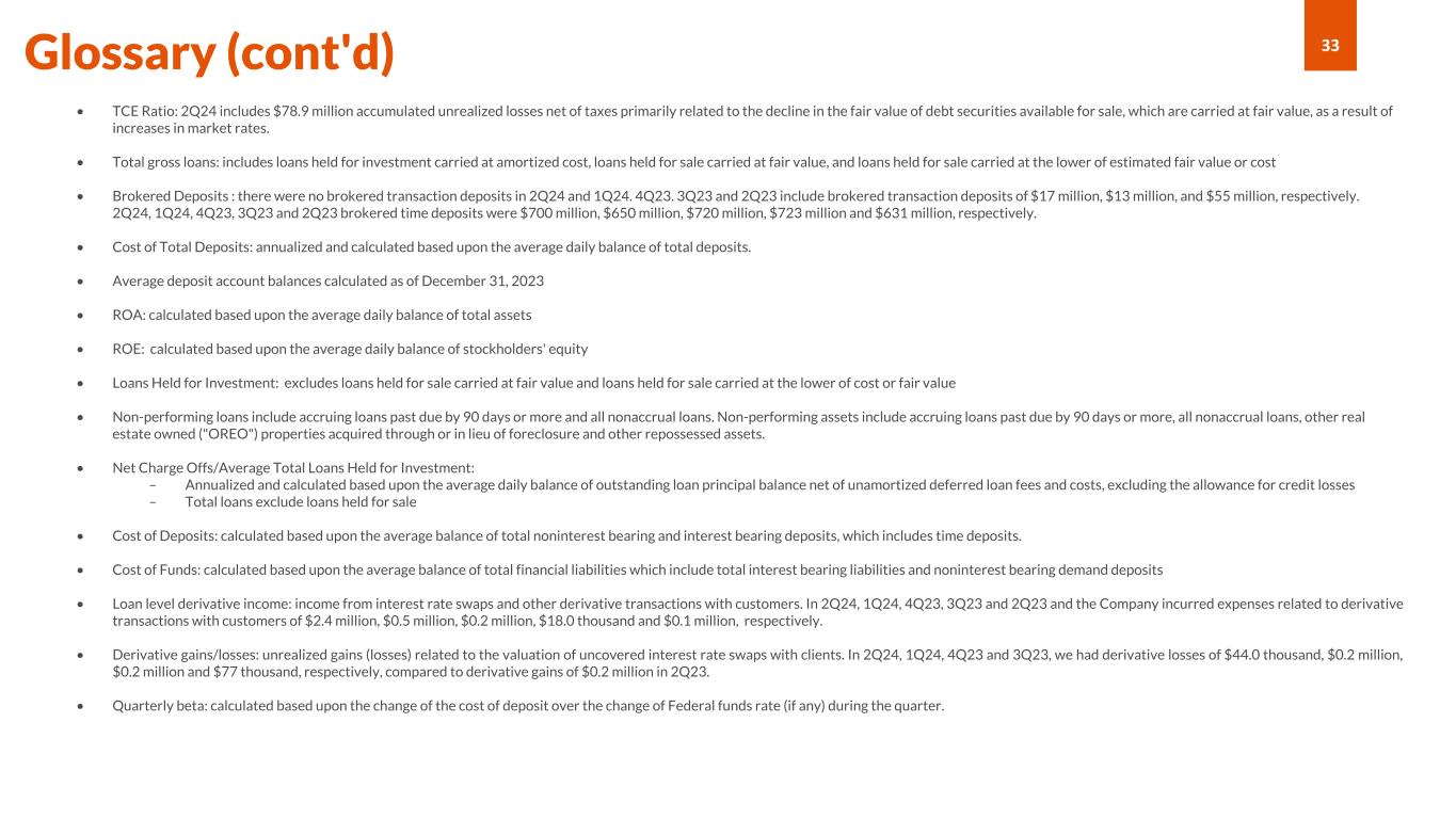33Glossary (cont'd) • TCE Ratio: 2Q24 includes $78.9 million accumulated unrealized losses net of taxes primarily related to the decline in the fair value of debt securities available for sale, which are carried at fair value, as a result of increases in market rates. • Total gross loans: includes loans held for investment carried at amortized cost, loans held for sale carried at fair value, and loans held for sale carried at the lower of estimated fair value or cost • Brokered Deposits : there were no brokered transaction deposits in 2Q24 and 1Q24. 4Q23. 3Q23 and 2Q23 include brokered transaction deposits of $17 million, $13 million, and $55 million, respectively. 2Q24, 1Q24, 4Q23, 3Q23 and 2Q23 brokered time deposits were $700 million, $650 million, $720 million, $723 million and $631 million, respectively. • Cost of Total Deposits: annualized and calculated based upon the average daily balance of total deposits. • Average deposit account balances calculated as of December 31, 2023 • ROA: calculated based upon the average daily balance of total assets • ROE: calculated based upon the average daily balance of stockholders' equity • Loans Held for Investment: excludes loans held for sale carried at fair value and loans held for sale carried at the lower of cost or fair value • Non-performing loans include accruing loans past due by 90 days or more and all nonaccrual loans. Non-performing assets include accruing loans past due by 90 days or more, all nonaccrual loans, other real estate owned ("OREO") properties acquired through or in lieu of foreclosure and other repossessed assets. • Net Charge Offs/Average Total Loans Held for Investment: – Annualized and calculated based upon the average daily balance of outstanding loan principal balance net of unamortized deferred loan fees and costs, excluding the allowance for credit losses – Total loans exclude loans held for sale • Cost of Deposits: calculated based upon the average balance of total noninterest bearing and interest bearing deposits, which includes time deposits. • Cost of Funds: calculated based upon the average balance of total financial liabilities which include total interest bearing liabilities and noninterest bearing demand deposits • Loan level derivative income: income from interest rate swaps and other derivative transactions with customers. In 2Q24, 1Q24, 4Q23, 3Q23 and 2Q23 and the Company incurred expenses related to derivative transactions with customers of $2.4 million, $0.5 million, $0.2 million, $18.0 thousand and $0.1 million, respectively. • Derivative gains/losses: unrealized gains (losses) related to the valuation of uncovered interest rate swaps with clients. In 2Q24, 1Q24, 4Q23 and 3Q23, we had derivative losses of $44.0 thousand, $0.2 million, $0.2 million and $77 thousand, respectively, compared to derivative gains of $0.2 million in 2Q23. • Quarterly beta: calculated based upon the change of the cost of deposit over the change of Federal funds rate (if any) during the quarter.