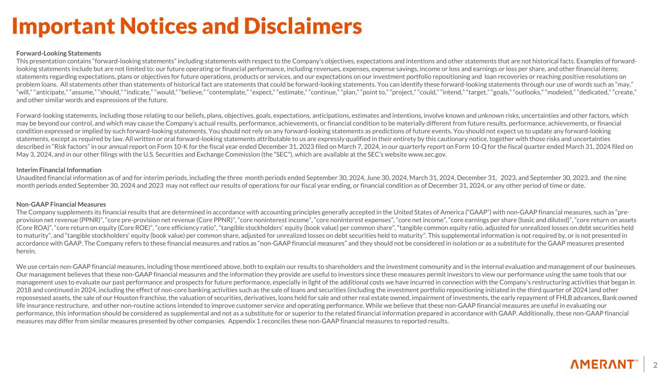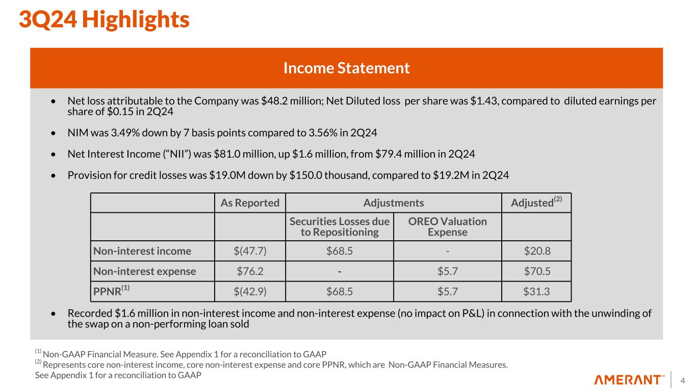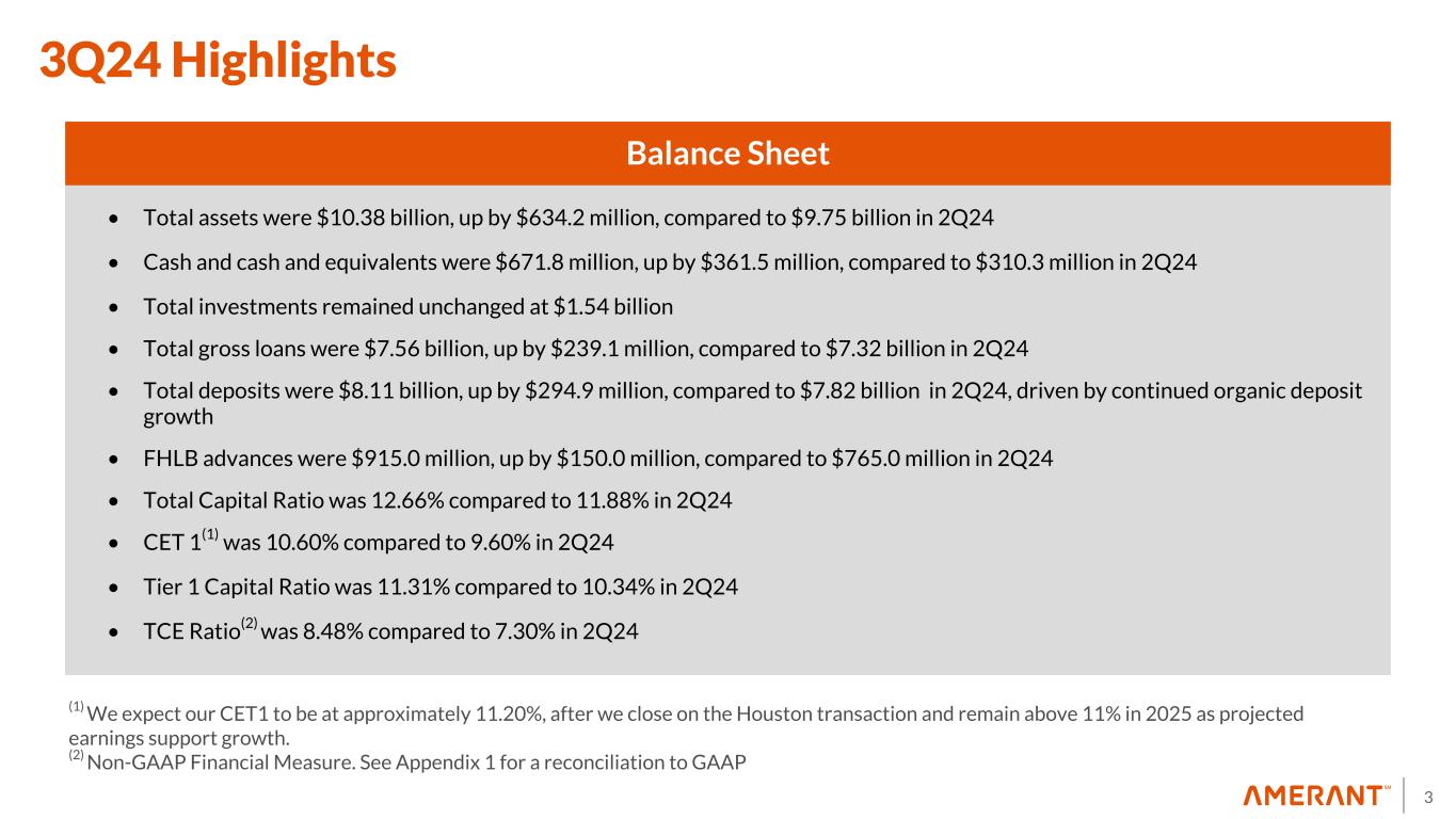 2 Important Notices and Disclaimers Forward-Looking Statements This presentation contains “forward-looking statements” including statements with respect to the Company’s objectives, expectations and intentions and other statements that are not historical facts. Examples of forward- looking statements include but are not limited to: our future operating or financial performance, including revenues, expenses, expense savings, income or loss and earnings or loss per share, and other financial items; statements regarding expectations, plans or objectives for future operations, products or services, and our expectations on our investment portfolio repositioning and loan recoveries or reaching positive resolutions on problem loans. All statements other than statements of historical fact are statements that could be forward-looking statements. You can identify these forward-looking statements through our use of words such as “may,” “will,” “anticipate,” “assume,” “should,” “indicate,” “would,” “believe,” “contemplate,” “expect,” “estimate,” “continue,” “plan,” “point to,” “project,” “could,” “intend,” “target,” “goals,” “outlooks,” “modeled,” “dedicated,” “create,” and other similar words and expressions of the future. Forward-looking statements, including those relating to our beliefs, plans, objectives, goals, expectations, anticipations, estimates and intentions, involve known and unknown risks, uncertainties and other factors, which may be beyond our control, and which may cause the Company’s actual results, performance, achievements, or financial condition to be materially different from future results, performance, achievements, or financial condition expressed or implied by such forward-looking statements. You should not rely on any forward-looking statements as predictions of future events. You should not expect us to update any forward-looking statements, except as required by law. All written or oral forward-looking statements attributable to us are expressly qualified in their entirety by this cautionary notice, together with those risks and uncertainties described in “Risk factors” in our annual report on Form 10-K for the fiscal year ended December 31, 2023 filed on March 7, 2024, in our quarterly report on Form 10-Q for the fiscal quarter ended March 31, 2024 filed on May 3, 2024, and in our other filings with the U.S. Securities and Exchange Commission (the “SEC”), which are available at the SEC’s website www.sec.gov. Interim Financial Information Unaudited financial information as of and for interim periods, including the three month periods ended September 30, 2024, June 30, 2024, March 31, 2024, December 31, 2023, and September 30, 2023, and the nine month periods ended September 30, 2024 and 2023 may not reflect our results of operations for our fiscal year ending, or financial condition as of December 31, 2024, or any other period of time or date. Non-GAAP Financial Measures The Company supplements its financial results that are determined in accordance with accounting principles generally accepted in the United States of America (“GAAP”) with non-GAAP financial measures, such as “pre- provision net revenue (PPNR)”, “core pre-provision net revenue (Core PPNR)”, “core noninterest income”, “core noninterest expenses”, “core net income”, “core earnings per share (basic and diluted)”, “core return on assets (Core ROA)”, “core return on equity (Core ROE)”, “core efficiency ratio”, “tangible stockholders’ equity (book value) per common share”, “tangible common equity ratio, adjusted for unrealized losses on debt securities held to maturity”, and “tangible stockholders' equity (book value) per common share, adjusted for unrealized losses on debt securities held to maturity”. This supplemental information is not required by, or is not presented in accordance with GAAP. The Company refers to these financial measures and ratios as “non-GAAP financial measures” and they should not be considered in isolation or as a substitute for the GAAP measures presented herein. We use certain non-GAAP financial measures, including those mentioned above, both to explain our results to shareholders and the investment community and in the internal evaluation and management of our businesses. Our management believes that these non-GAAP financial measures and the information they provide are useful to investors since these measures permit investors to view our performance using the same tools that our management uses to evaluate our past performance and prospects for future performance, especially in light of the additional costs we have incurred in connection with the Company’s restructuring activities that began in 2018 and continued in 2024, including the effect of non-core banking activities such as the sale of loans and securities (including the investment portfolio repositioning initiated in the third quarter of 2024 )and other repossessed assets, the sale of our Houston franchise, the valuation of securities, derivatives, loans held for sale and other real estate owned, impairment of investments, the early repayment of FHLB advances, Bank owned life insurance restructure, and other non-routine actions intended to improve customer service and operating performance. While we believe that these non-GAAP financial measures are useful in evaluating our performance, this information should be considered as supplemental and not as a substitute for or superior to the related financial information prepared in accordance with GAAP. Additionally, these non-GAAP financial measures may differ from similar measures presented by other companies. Appendix 1 reconciles these non-GAAP financial measures to reported results.