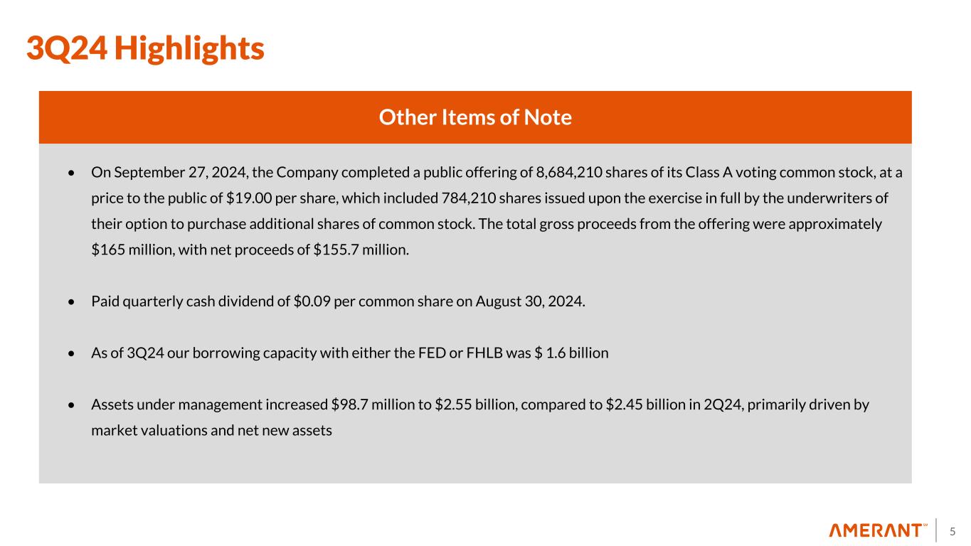 4 3Q24 Highlights Income Statement • Net loss attributable to the Company was $48.2 million; Net Diluted loss per share was $1.43, compared to diluted earnings per share of $0.15 in 2Q24 • NIM was 3.49% down by 7 basis points compared to 3.56% in 2Q24 • Net Interest Income (“NII”) was $81.0 million, up $1.6 million, from $79.4 million in 2Q24 • Provision for credit losses was $19.0M down by $150.0 thousand, compared to $19.2M in 2Q24 • Recorded $1.6 million in non-interest income and non-interest expense (no impact on P&L) in connection with the unwinding of the swap on a non-performing loan sold (1) Non-GAAP Financial Measure. See Appendix 1 for a reconciliation to GAAP (2) Represents core non-interest income, core non-interest expense and core PPNR, which are Non-GAAP Financial Measures. See Appendix 1 for a reconciliation to GAAP As Reported Adjustments Adjusted(2) Securities Losses due to Repositioning OREO Valuation Expense Non-interest income $(47.7) $68.5 - $20.8 Non-interest expense $76.2 - $5.7 $70.5 PPNR(1) $(42.9) $68.5 $5.7 $31.3