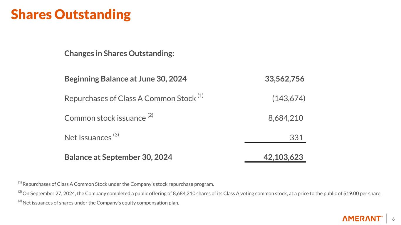 6 Shares Outstanding Changes in Shares Outstanding: Beginning Balance at June 30, 2024 33,562,756 Repurchases of Class A Common Stock (1) (143,674) Common stock issuance (2) 8,684,210 Net Issuances (3) 331 Balance at September 30, 2024 42,103,623 (1) Repurchases of Class A Common Stock under the Company's stock repurchase program. (2) On September 27, 2024, the Company completed a public offering of 8,684,210 shares of its Class A voting common stock, at a price to the public of $19.00 per share. (3) Net issuances of shares under the Company's equity compensation plan.