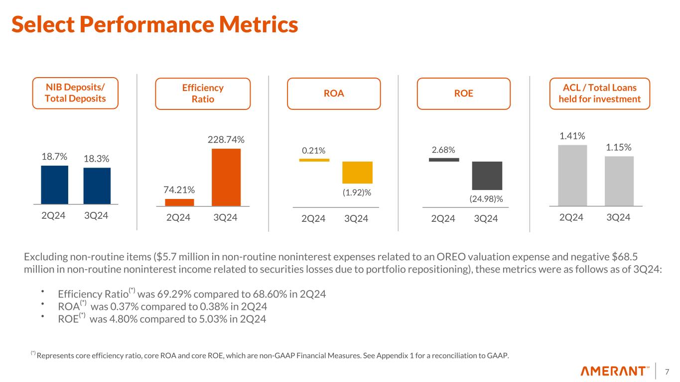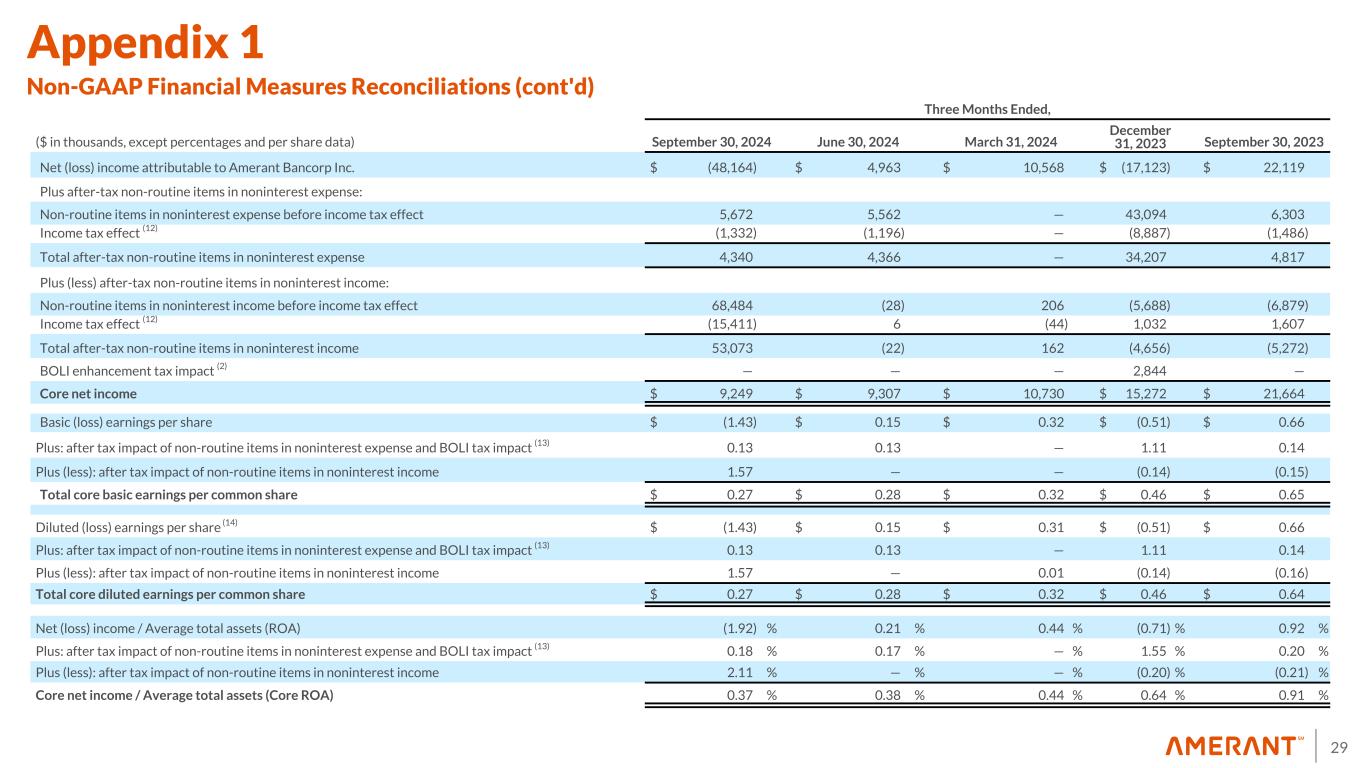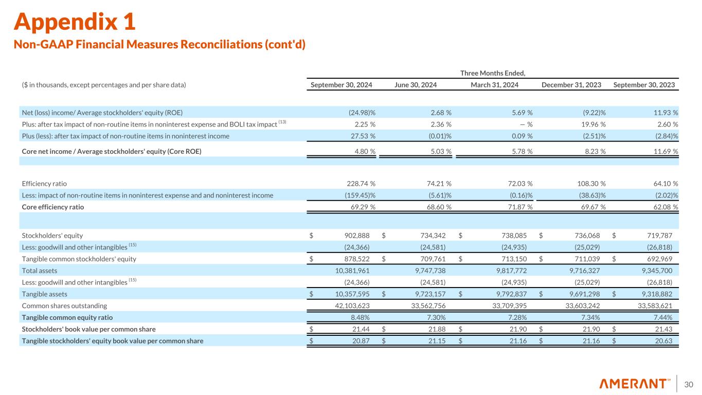 29 Three Months Ended, ($ in thousands, except percentages and per share data) September 30, 2024 June 30, 2024 March 31, 2024 December 31, 2023 September 30, 2023 Net (loss) income attributable to Amerant Bancorp Inc. $ (48,164) $ 4,963 $ 10,568 $ (17,123) $ 22,119 Plus after-tax non-routine items in noninterest expense: Non-routine items in noninterest expense before income tax effect 5,672 5,562 — 43,094 6,303 Income tax effect (12) (1,332) (1,196) — (8,887) (1,486) Total after-tax non-routine items in noninterest expense 4,340 4,366 — 34,207 4,817 Plus (less) after-tax non-routine items in noninterest income: Non-routine items in noninterest income before income tax effect 68,484 (28) 206 (5,688) (6,879) Income tax effect (12) (15,411) 6 (44) 1,032 1,607 Total after-tax non-routine items in noninterest income 53,073 (22) 162 (4,656) (5,272) BOLI enhancement tax impact (2) — — — 2,844 — Core net income $ 9,249 $ 9,307 $ 10,730 $ 15,272 $ 21,664 Basic (loss) earnings per share $ (1.43) $ 0.15 $ 0.32 $ (0.51) $ 0.66 Plus: after tax impact of non-routine items in noninterest expense and BOLI tax impact (13) 0.13 0.13 — 1.11 0.14 Plus (less): after tax impact of non-routine items in noninterest income 1.57 — — (0.14) (0.15) Total core basic earnings per common share $ 0.27 $ 0.28 $ 0.32 $ 0.46 $ 0.65 Diluted (loss) earnings per share (14) $ (1.43) $ 0.15 $ 0.31 $ (0.51) $ 0.66 Plus: after tax impact of non-routine items in noninterest expense and BOLI tax impact (13) 0.13 0.13 — 1.11 0.14 Plus (less): after tax impact of non-routine items in noninterest income 1.57 — 0.01 (0.14) (0.16) Total core diluted earnings per common share $ 0.27 $ 0.28 $ 0.32 $ 0.46 $ 0.64 Net (loss) income / Average total assets (ROA) (1.92) % 0.21 % 0.44 % (0.71) % 0.92 % Plus: after tax impact of non-routine items in noninterest expense and BOLI tax impact (13) 0.18 % 0.17 % — % 1.55 % 0.20 % Plus (less): after tax impact of non-routine items in noninterest income 2.11 % — % — % (0.20) % (0.21) % Core net income / Average total assets (Core ROA) 0.37 % 0.38 % 0.44 % 0.64 % 0.91 % Appendix 1 Non-GAAP Financial Measures Reconciliations (cont'd)