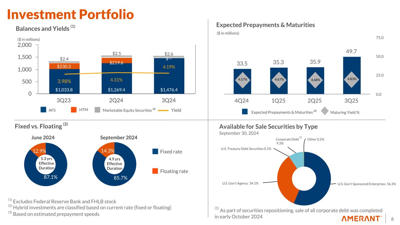 7 74.21% 228.74% 2Q24 3Q24 18.7% 18.3% 2Q24 3Q24 1.41% 1.15% 2Q24 3Q24 0.21% (1.92)% 2Q24 3Q24 2.68% (24.98)% 2Q24 3Q24 NIB Deposits/ Total Deposits Efficiency Ratio ACL / Total Loans held for investment ROA ROE Select Performance Metrics Excluding non-routine items ($5.7 million in non-routine noninterest expenses related to an OREO valuation expense and negative $68.5 million in non-routine noninterest income related to securities losses due to portfolio repositioning), these metrics were as follows as of 3Q24: • Efficiency Ratio(*) was 69.29% compared to 68.60% in 2Q24 • ROA(*) was 0.37% compared to 0.38% in 2Q24 • ROE(*) was 4.80% compared to 5.03% in 2Q24 (*) Represents core efficiency ratio, core ROA and core ROE, which are non-GAAP Financial Measures. See Appendix 1 for a reconciliation to GAAP.
