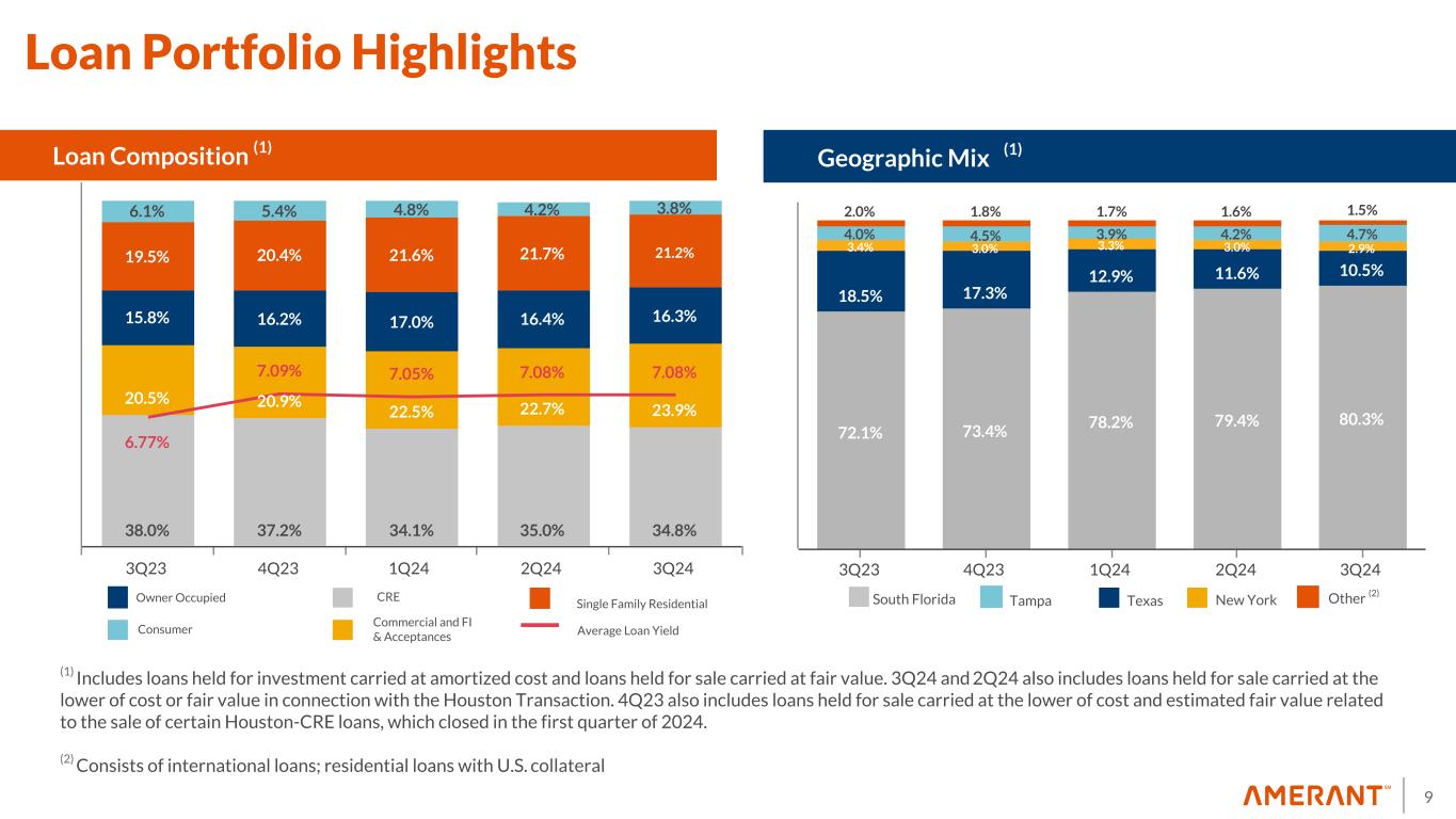 8 85.7% 14.3% U.S. Gov't Sponsored Enterprises 56.3%U.S. Gov't Agency 34.1% U.S. Treasury Debt Securities 0.1% Corporate Debt 9.3% Other 0.2% $1,033.8 $1,269.4 $1,476.4 $230.3 $219.6 $—$2.4 $2.5 $2.6 3.98% 4.31% 4.19% 3Q23 2Q24 3Q24 0 500 1,000 1,500 2,000 87.1% 12.9% Balances and Yields (1) AFS HTM Fixed vs. Floating (2) September 2024 Floating rate Fixed rate Available for Sale Securities by Type September 30, 2024 5.3 yrs Effective Duration ($ in millions) Marketable Equity Securities (2) (1) Excludes Federal Reserve Bank and FHLB stock (2) Hybrid investments are classified based on current rate (fixed or floating) (3) Based on estimated prepayment speeds Yield 4.9 yrs Effective Duration 33.5 35.3 35.9 49.7 4Q24 1Q25 2Q25 3Q25 0.0 25.0 50.0 75.0 ($ in millions) Expected Prepayments & Maturities Expected Prepayments & Maturities (3) Maturing Yield % Investment Portfolio 4.57% 4.67% 4.68% 4.83% June 2024 (1) As part of securities repositioning, sale of all corporate debt was completed in early October 2024 (1)
