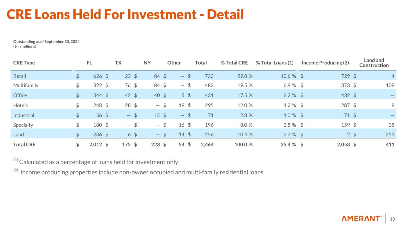 9 38.0% 37.2% 34.1% 35.0% 34.8% 20.5% 20.9% 22.5% 22.7% 23.9% 15.8% 16.2% 17.0% 16.4% 16.3% 19.5% 20.4% 21.6% 21.7% 21.2% 6.1% 5.4% 4.8% 4.2% 3.8% 6.77% 7.09% 7.05% 7.08% 7.08% 3Q23 4Q23 1Q24 2Q24 3Q24 72.1% 73.4% 78.2% 79.4% 80.3% 18.5% 17.3% 12.9% 11.6% 10.5% 3.4% 3.0% 3.3% 3.0% 2.9% 4.0% 4.5% 3.9% 4.2% 4.7% 2.0% 1.8% 1.7% 1.6% 1.5% 3Q23 4Q23 1Q24 2Q24 3Q24 Consumer CRE Commercial and FI & Acceptances Owner Occupied Single Family Residential Loan Composition (1) Geographic Mix (Domestic) Geographic ix (1) South Florida Texas New York Average Loan Yield Other (2) (1) Includes loans held for investment carried at amortized cost and loans held for sale carried at fair value. 3Q24 and 2Q24 also includes loans held for sale carried at the lower of cost or fair value in connection with the Houston Transaction. 4Q23 also includes loans held for sale carried at the lower of cost and estimated fair value related to the sale of certain Houston-CRE loans, which closed in the first quarter of 2024. (2) Consists of international loans; residential loans with U.S. collateral Tampa Loan Portfolio Highlights