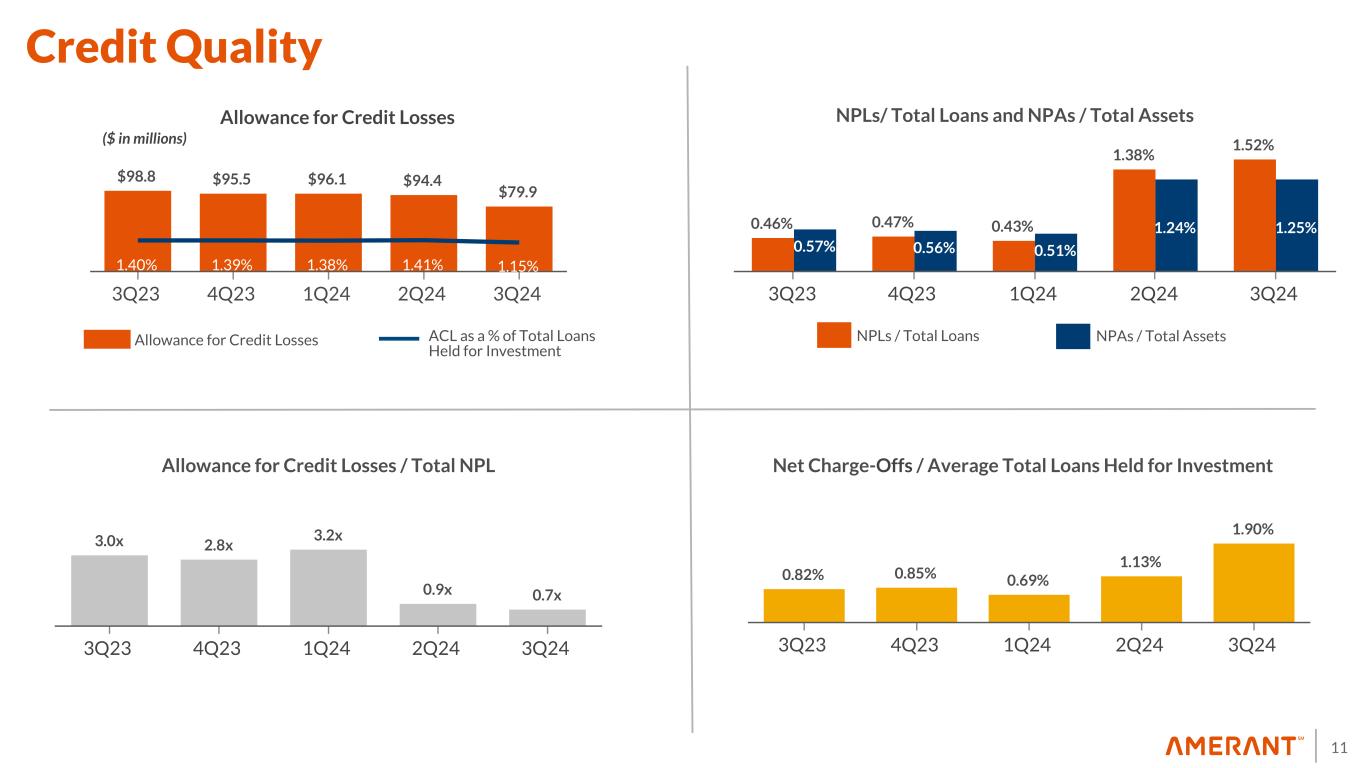10 CRE Type FL TX NY Other Total % Total CRE % Total Loans (1) Income Producing (2) Land and Construction Retail $ 626 $ 23 $ 84 $ — $ 733 29.8 % 10.6 % $ 729 $ 4 Multifamily $ 322 $ 76 $ 84 $ — $ 482 19.5 % 6.9 % $ 373 $ 108 Office $ 344 $ 42 $ 40 $ 5 $ 431 17.5 % 6.2 % $ 432 $ — Hotels $ 248 $ 28 $ — $ 19 $ 295 12.0 % 4.2 % $ 287 $ 8 Industrial $ 56 $ — $ 15 $ — $ 71 2.8 % 1.0 % $ 71 $ — Specialty $ 180 $ — $ — $ 16 $ 196 8.0 % 2.8 % $ 159 $ 38 Land $ 236 $ 6 $ — $ 14 $ 256 10.4 % 3.7 % $ 2 $ 253 Total CRE $ 2,012 $ 175 $ 223 $ 54 $ 2,464 100.0 % 35.4 % $ 2,053 $ 411 Outstanding as of September 30, 2024 ($ in millions) (1) Calculated as a percentage of loans held for investment only (2) Income producing properties include non-owner occupied and multi-family residential loans CRE Loans Held For Investment - Detail