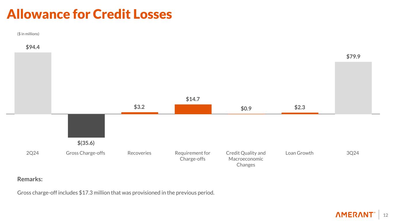 11 0.46% 0.47% 0.43% 1.38% 1.52% 0.57% 0.56% 0.51% 1.24% 1.25% 3Q23 4Q23 1Q24 2Q24 3Q24 3.0x 2.8x 3.2x 0.9x 0.7x 3Q23 4Q23 1Q24 2Q24 3Q24 $98.8 $95.5 $96.1 $94.4 $79.9 1.40% 1.39% 1.38% 1.41% 1.15% 3Q23 4Q23 1Q24 2Q24 3Q24 0.82% 0.85% 0.69% 1.13% 1.90% 3Q23 4Q23 1Q24 2Q24 3Q24 Net Charge-Offs / Average Total Loans Held for Investment Allowance for Credit Losses ($ in millions) NPLs/ Total Loans and NPAs / Total Assets Allowance for Credit Losses / Total NPL Allowance for Credit Losses ACL as a % of Total Loans Held for Investment NPLs / Total Loans NPAs / Total Assets Credit Quality