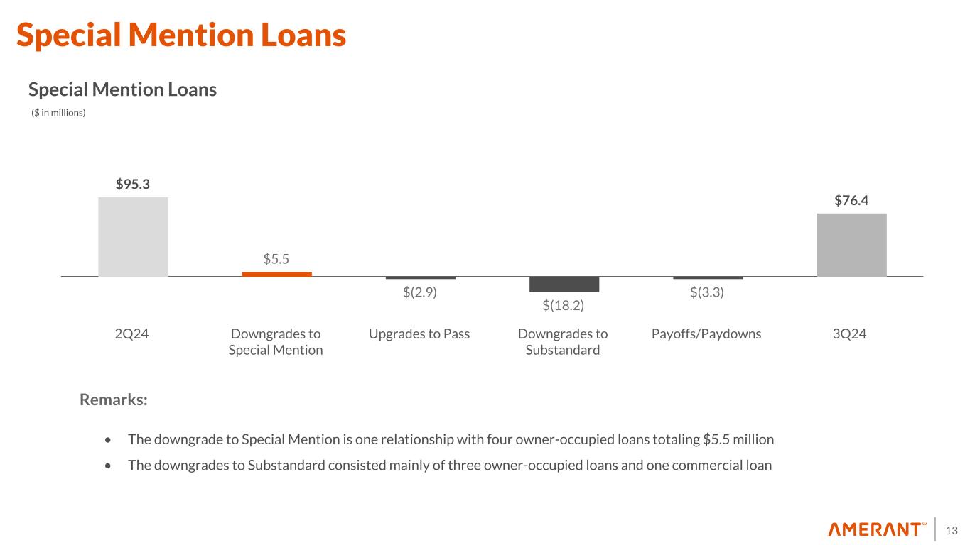 12 $94.4 $(35.6) $3.2 $14.7 $0.9 $2.3 $79.9 2Q24 Gross Charge-offs Recoveries Requirement for Charge-offs Credit Quality and Macroeconomic Changes Loan Growth 3Q24 ($ in millions) Allowance for Credit Losses Remarks: Gross charge-off includes $17.3 million that was provisioned in the previous period.