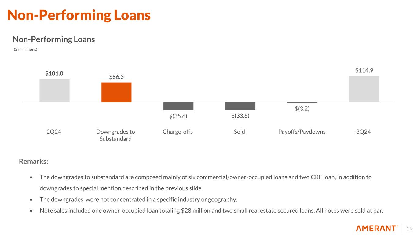 13 Special Mention Loans $95.3 $5.5 $(2.9) $(18.2) $(3.3) $76.4 2Q24 Downgrades to Special Mention Upgrades to Pass Downgrades to Substandard Payoffs/Paydowns 3Q24 ($ in millions) Special Mention Loans Remarks: • The downgrade to Special Mention is one relationship with four owner-occupied loans totaling $5.5 million • The downgrades to Substandard consisted mainly of three owner-occupied loans and one commercial loan