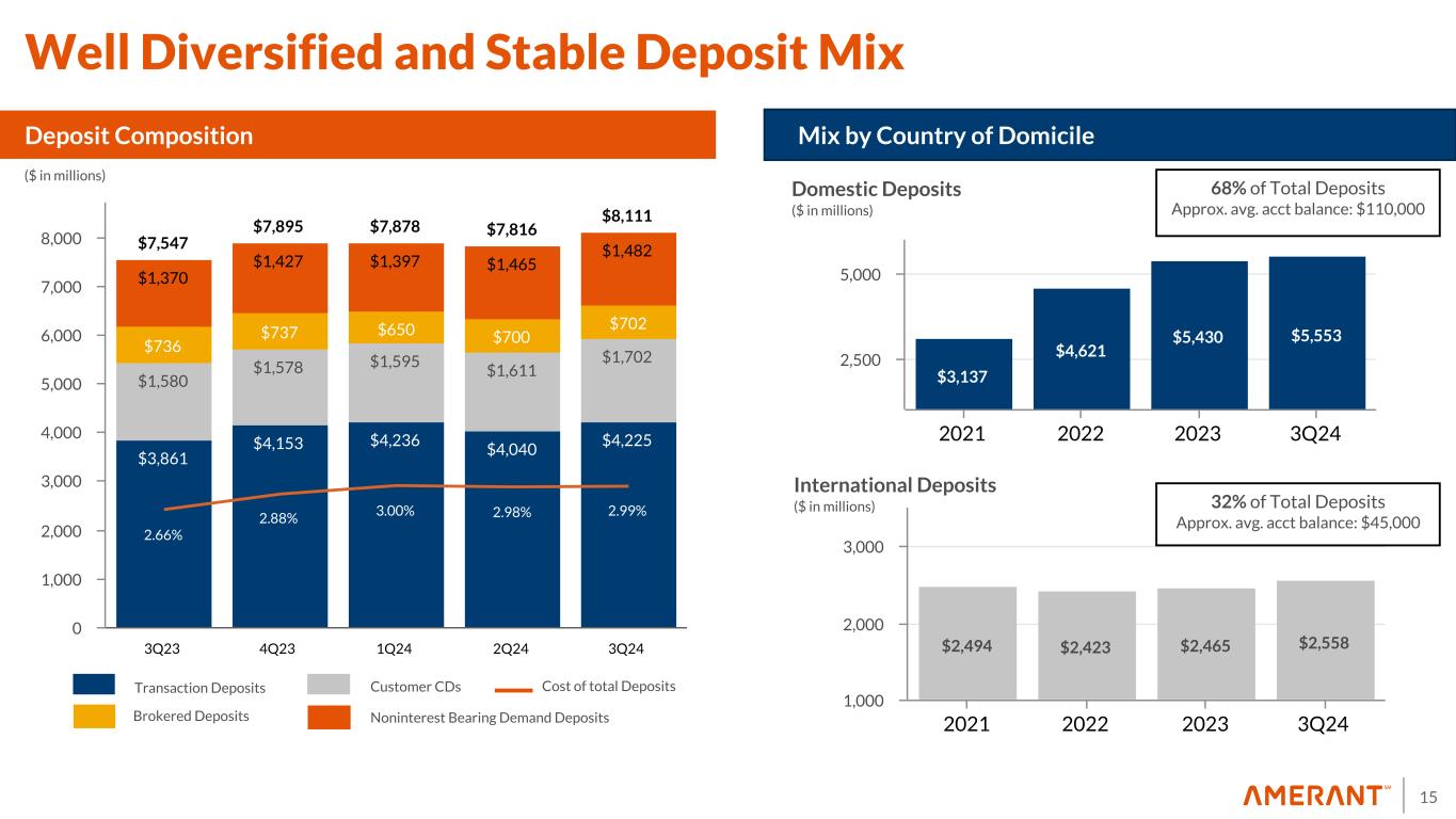 14 Non-Performing Loans $101.0 $86.3 $(35.6) $(33.6) $(3.2) $114.9 2Q24 Downgrades to Substandard Charge-offs Sold Payoffs/Paydowns 3Q24 ($ in millions) Non-Performing Loans Remarks: • The downgrades to substandard are composed mainly of six commercial/owner-occupied loans and two CRE loan, in addition to downgrades to special mention described in the previous slide • The downgrades were not concentrated in a specific industry or geography. • Note sales included one owner-occupied loan totaling $28 million and two small real estate secured loans. All notes were sold at par.